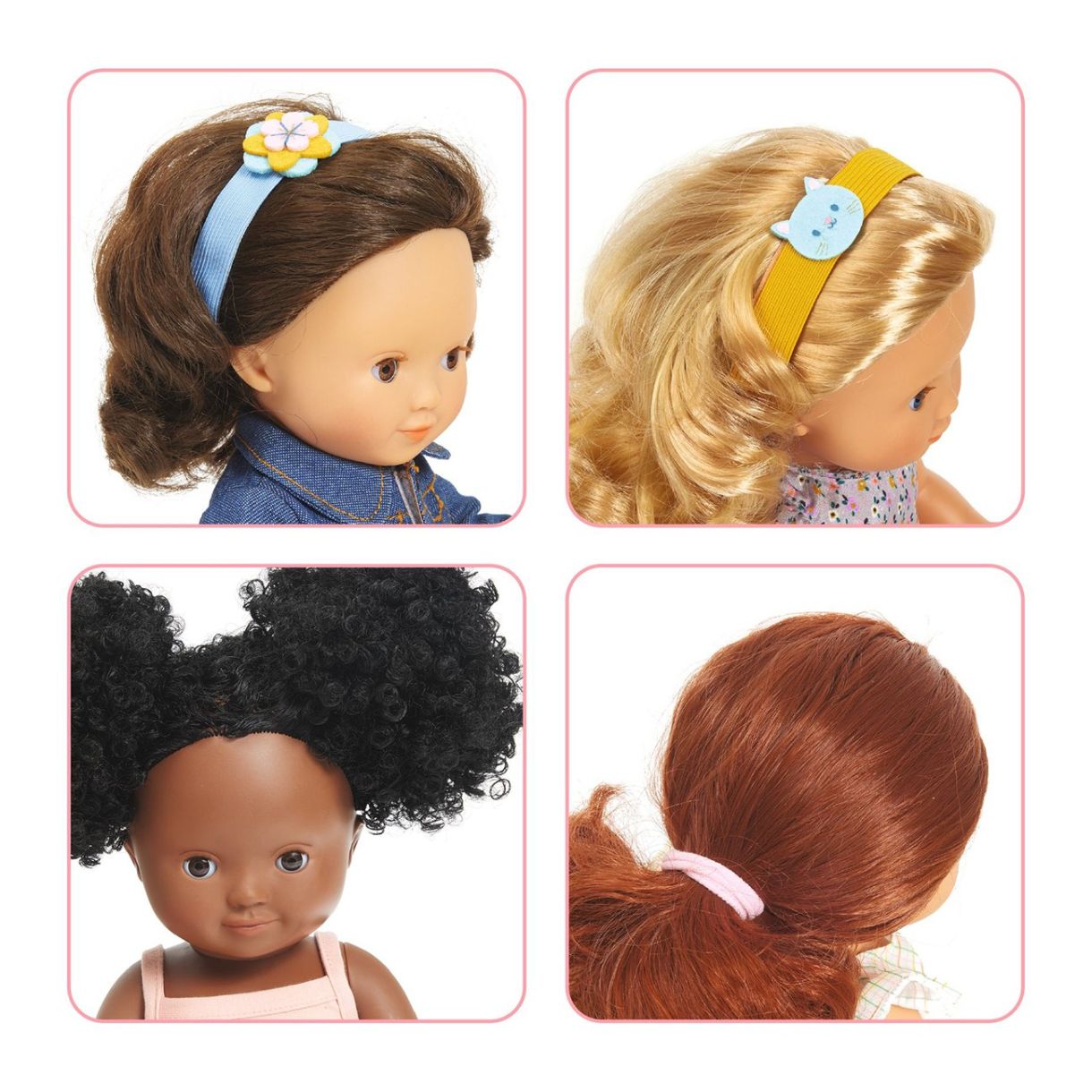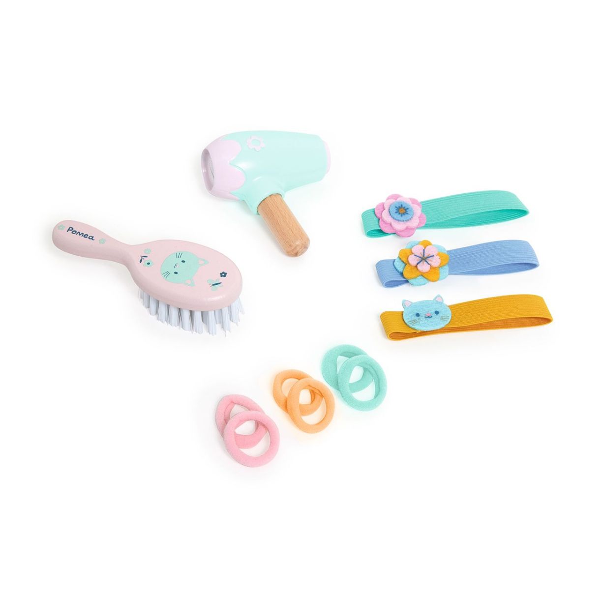 С вашия красив, обширен комплект за оформяне на прически станете чирак фризьор и създавайте всякакви прически на вашата кукла. След като изсушите косата на куклата си, срешете я и я накарайте да заблести. Време е да изберете прическа, но коя? 3 супер сладки ленти за коса с малка котка, цветя, които могат лесно да се поставят на главата на вашата кукла и 6 дунапренени ластика за коса: идеални за правене на прически.