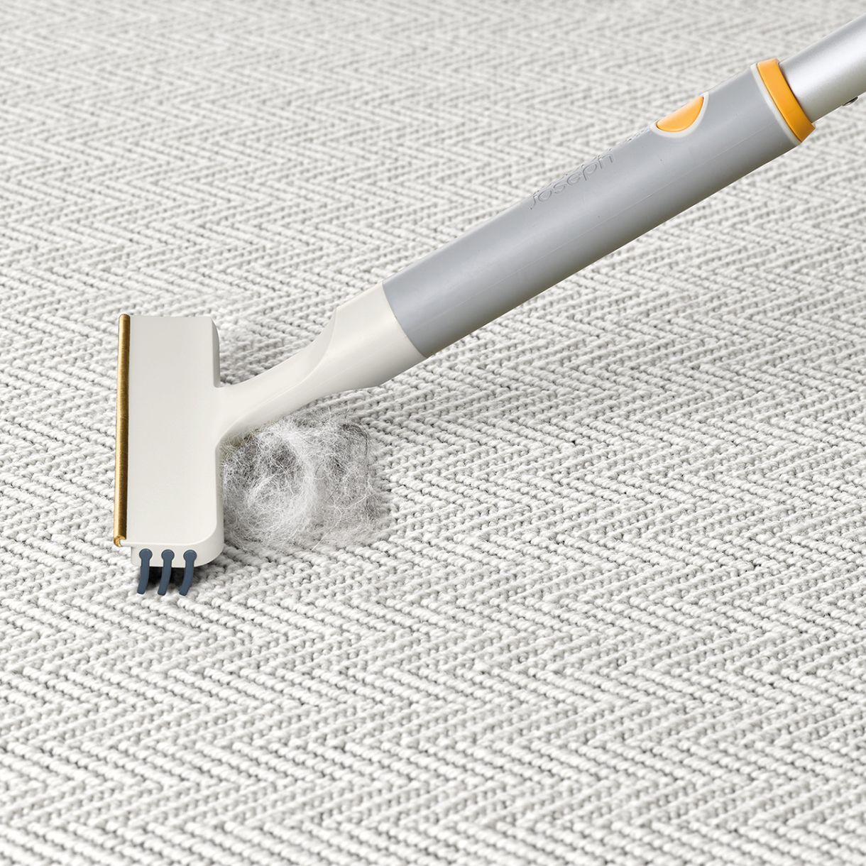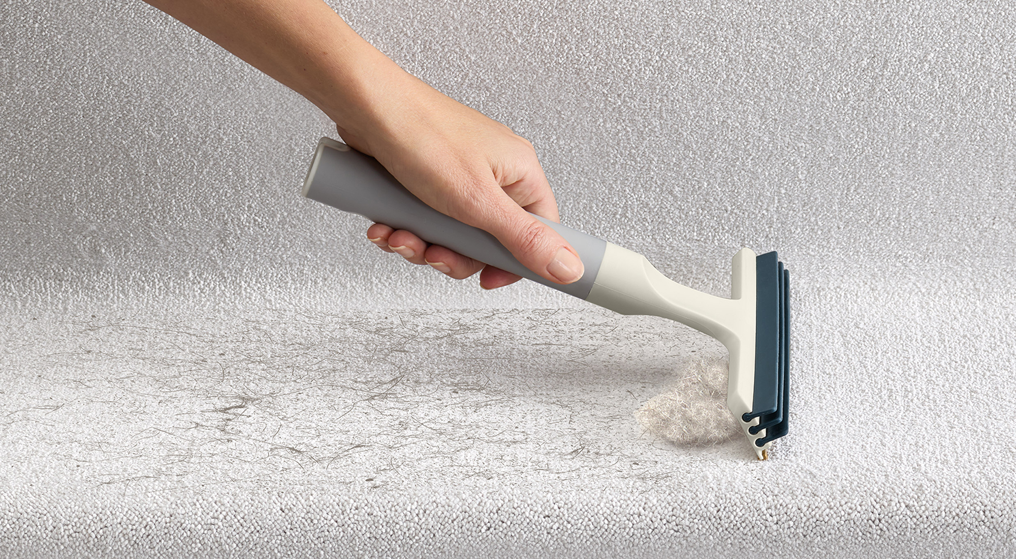 Този 2-в-1 инструмент за почистване на килими ви позволява лесно да премахнете косми, които прахосмукачките често пропускат.