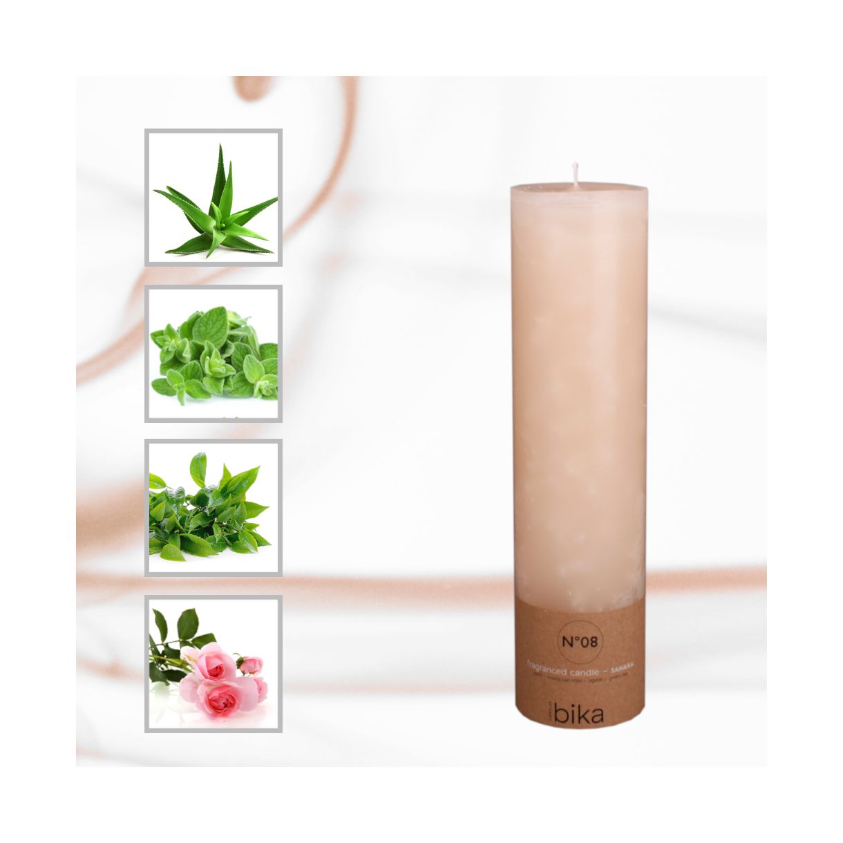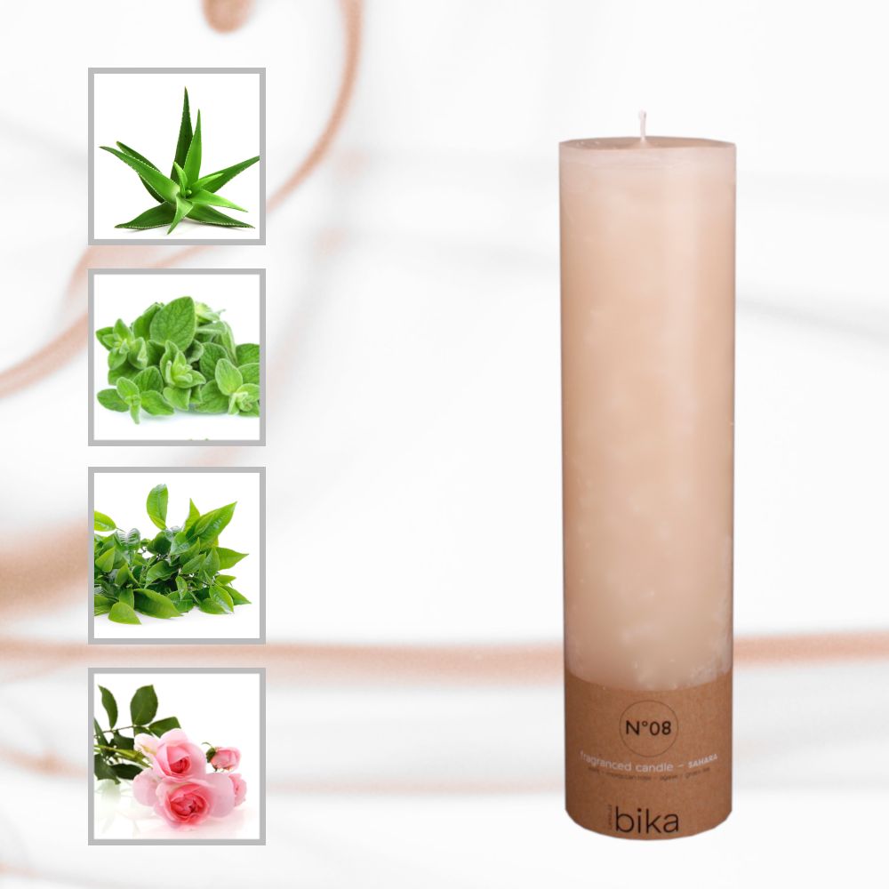 Листа от мента, мароканска роза, нектар от агаве и зелен чай ви потапят в страстния аромат на горещ пясък и синия час. Този луксозен аромат ще ви отнесе в страната на 1001 нощи или ще ви събуди опияняващи спомени за почивка на плажа в слънчева дестинация. Пясъчният цвят на тази ароматна свещ напомня за пустинята или плажа.