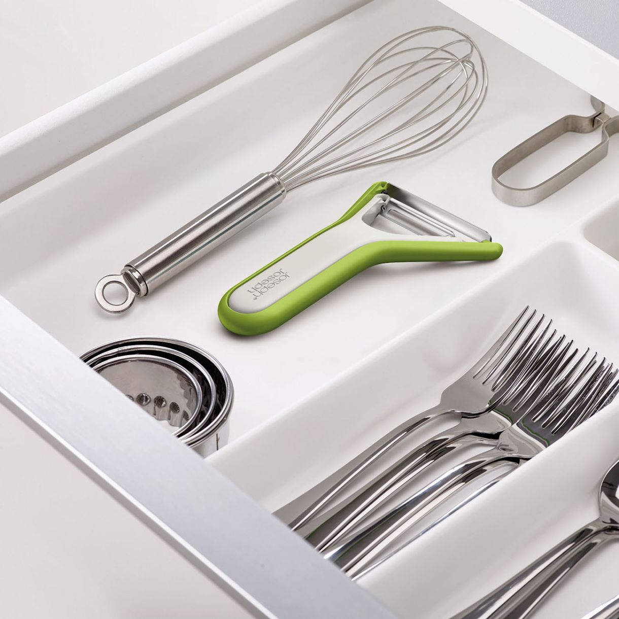 Две белачки. Едно подредено място. Край на ровенето в приборите ви - спретнато компактно съхранение за този комплект белачки.