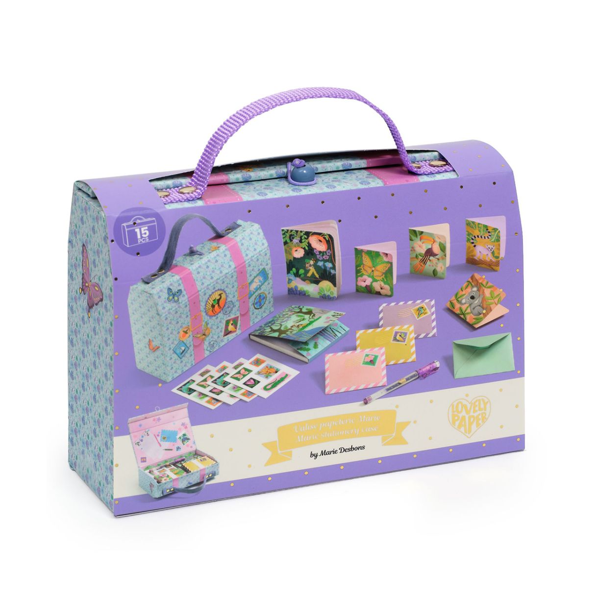 Открийте това вдъхновено от модата куфарче с канцеларски материали! Изработено от здрав картон, то има уникална закопчалка с дървена топка и ластик. Пълна е с елегантна и практична селекция от канцеларски материали: тефтер, бележник, стикери, гел химикал, 4 плика и 4 покани, идеални за писане, рисуване или изпращане на съобщения. Истинска съкровищница за любителите на изящни канцеларски материали!