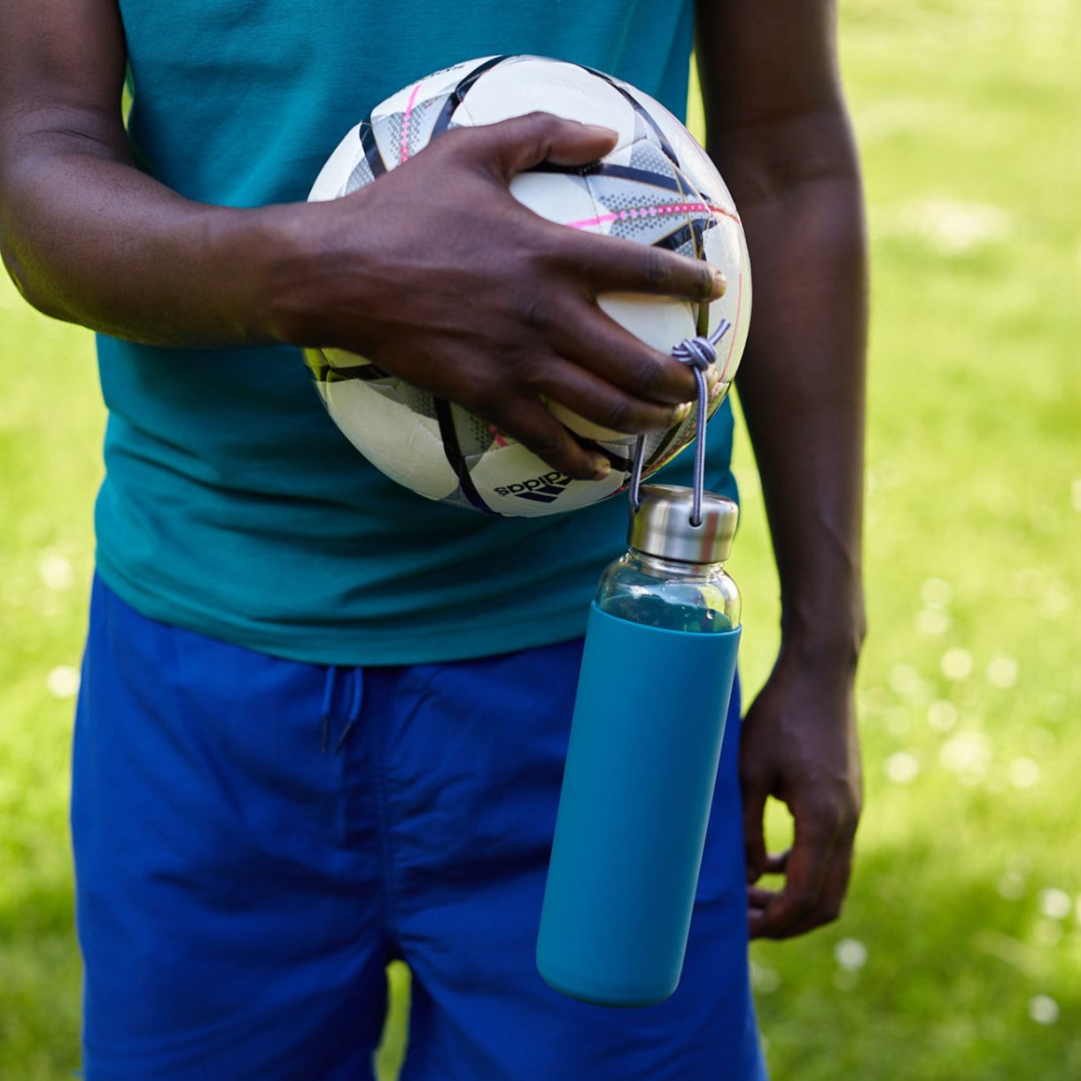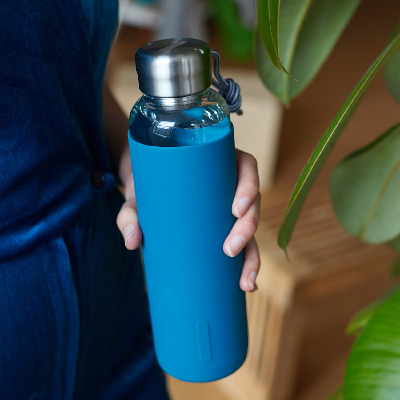 Стъклена бутилка от боросиликатно стъкло със защитен, не хлъзгащ се, силиконов ръкав, удобна дръжка и капачка от неръждаема стомана. Изработена е от английската компания Black+Blum.