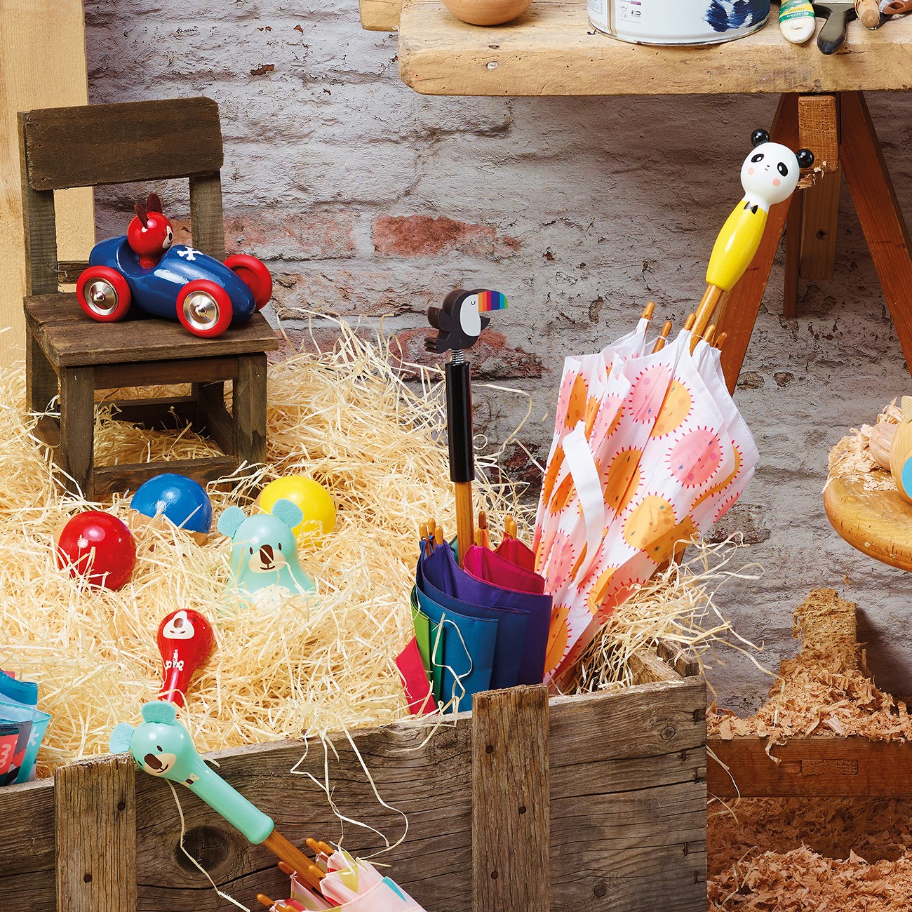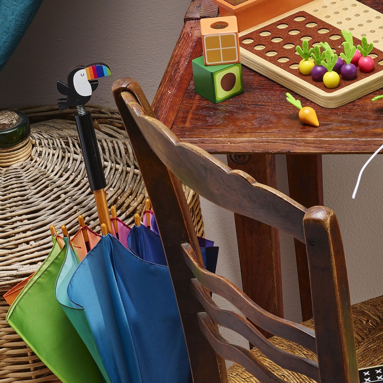 • Удобен за детето чадър от масивна дървесина.