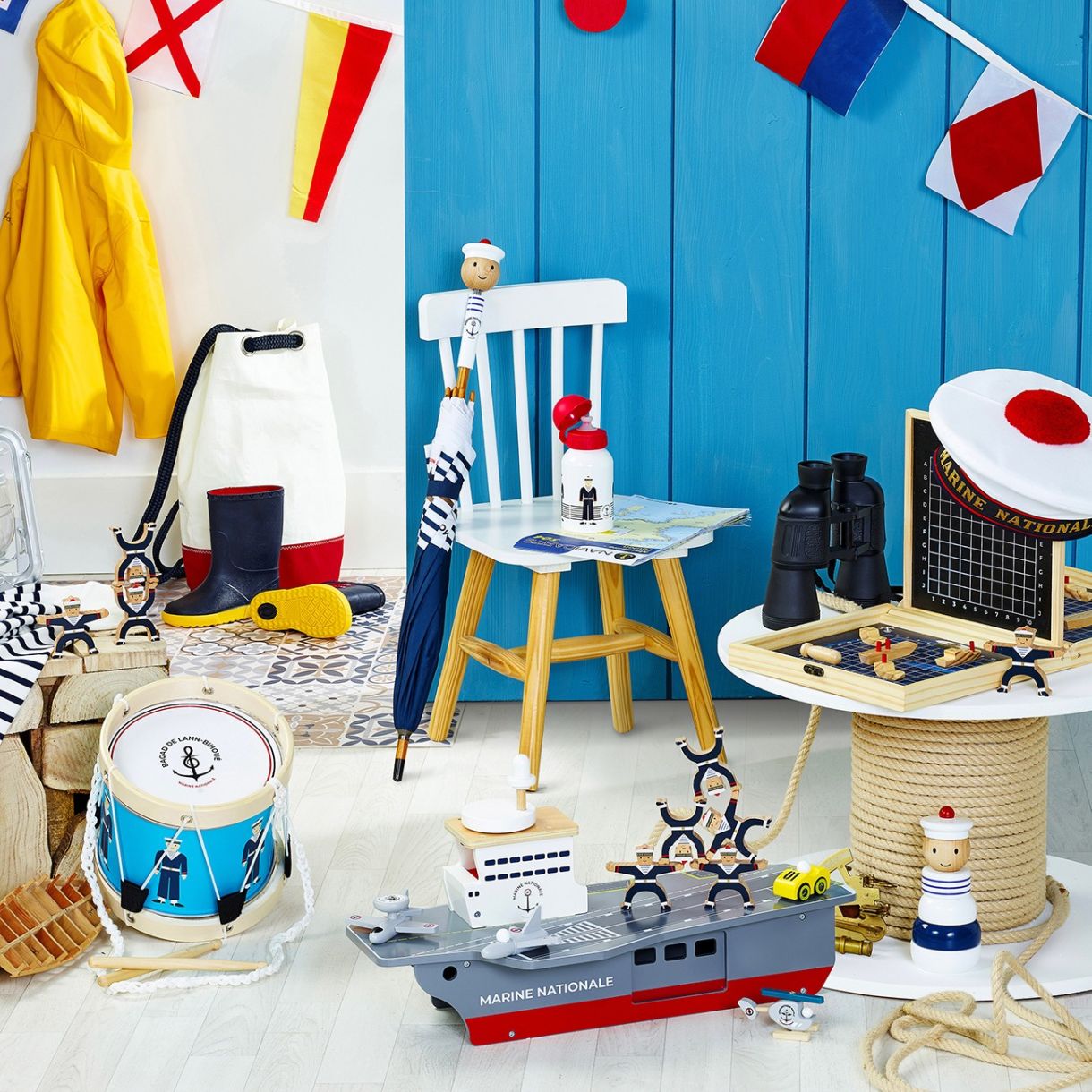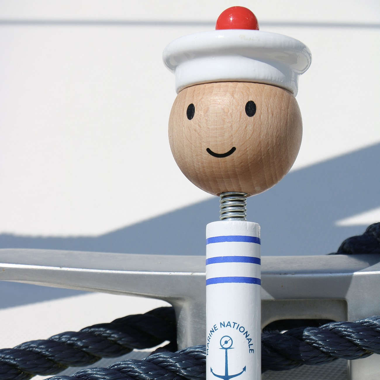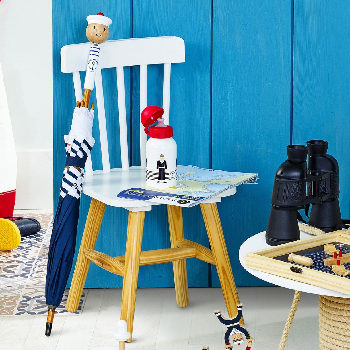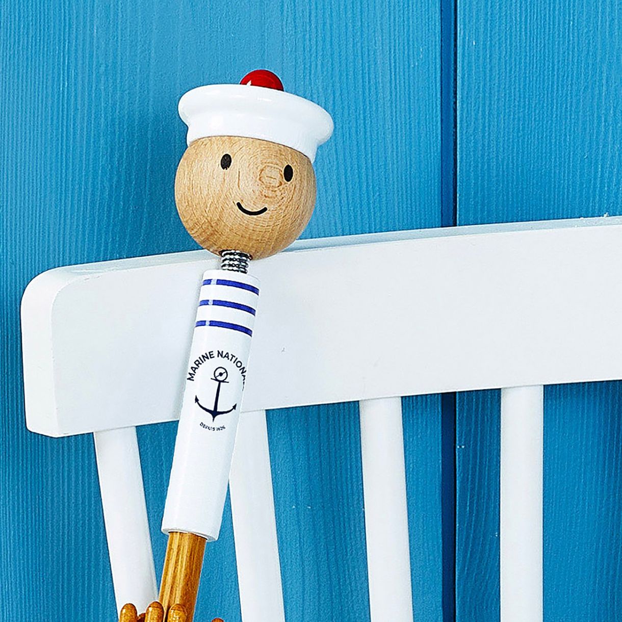 Проектиран от Vilac и френските военноморски сили, чадърът "Ecole des mousses" има всичко, което бихте могли да си пожелаете, с цветовете си, вдъхновени от униформите на екипажите, и с пружинното си копче във формата на моряшка глава.Този чадър е истински аксесоар, оразмерен за деца на възраст от 3 до 8 години. Произведен във Франция, той е изработен от лакирана масивна дървесина за елегантност и издръжливост и карбон в рамката, за да устои на пориви и усуквания. Този симпатичен чадър има система за отваряне и затваряне против прищипване, за да предпази малките пръсти на ползвателя си.