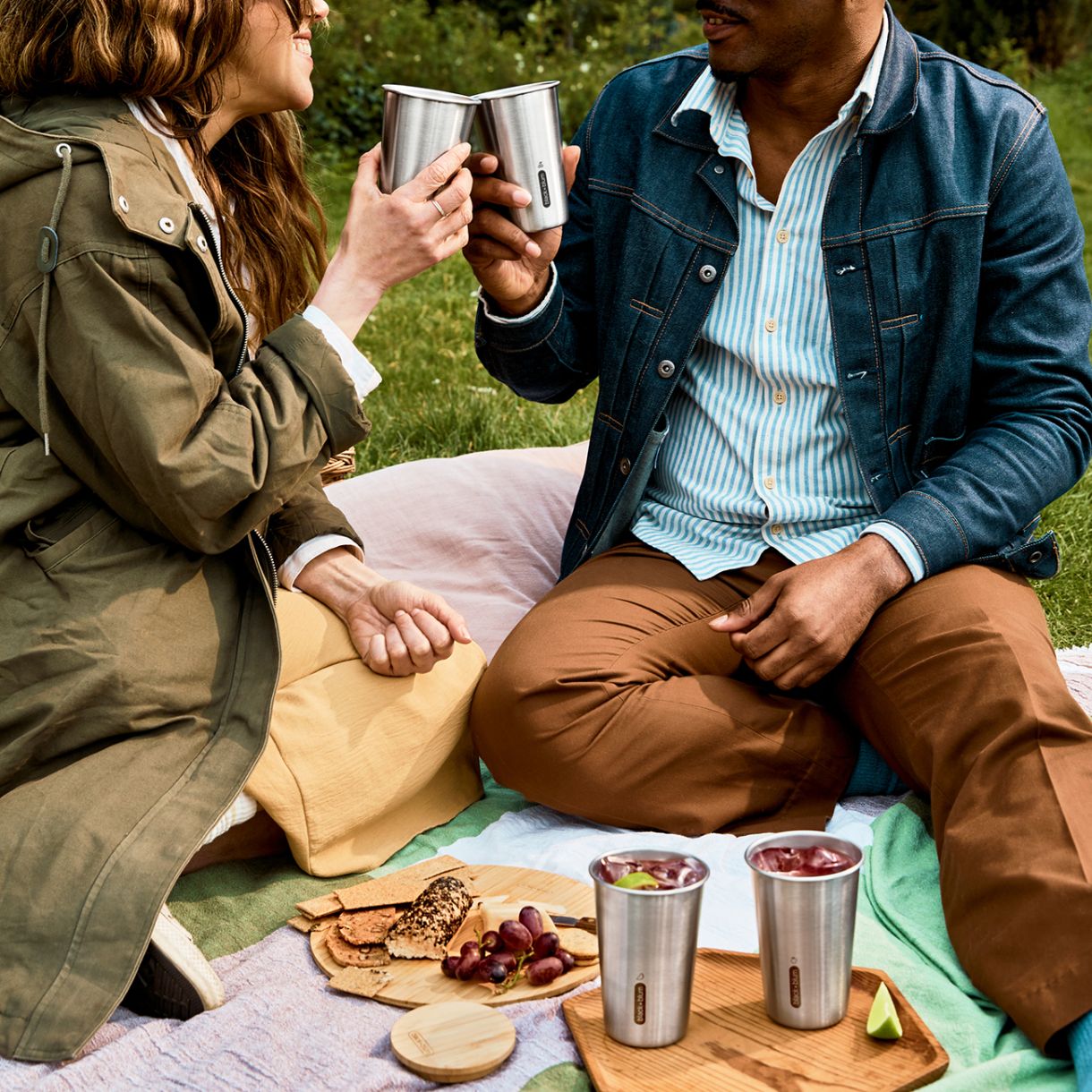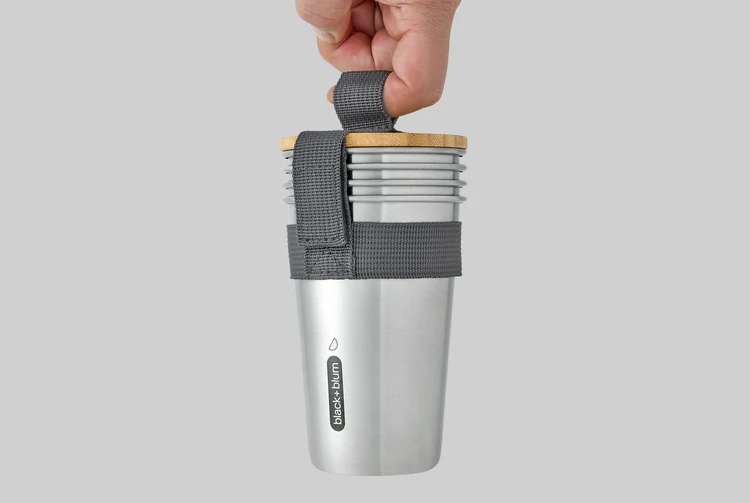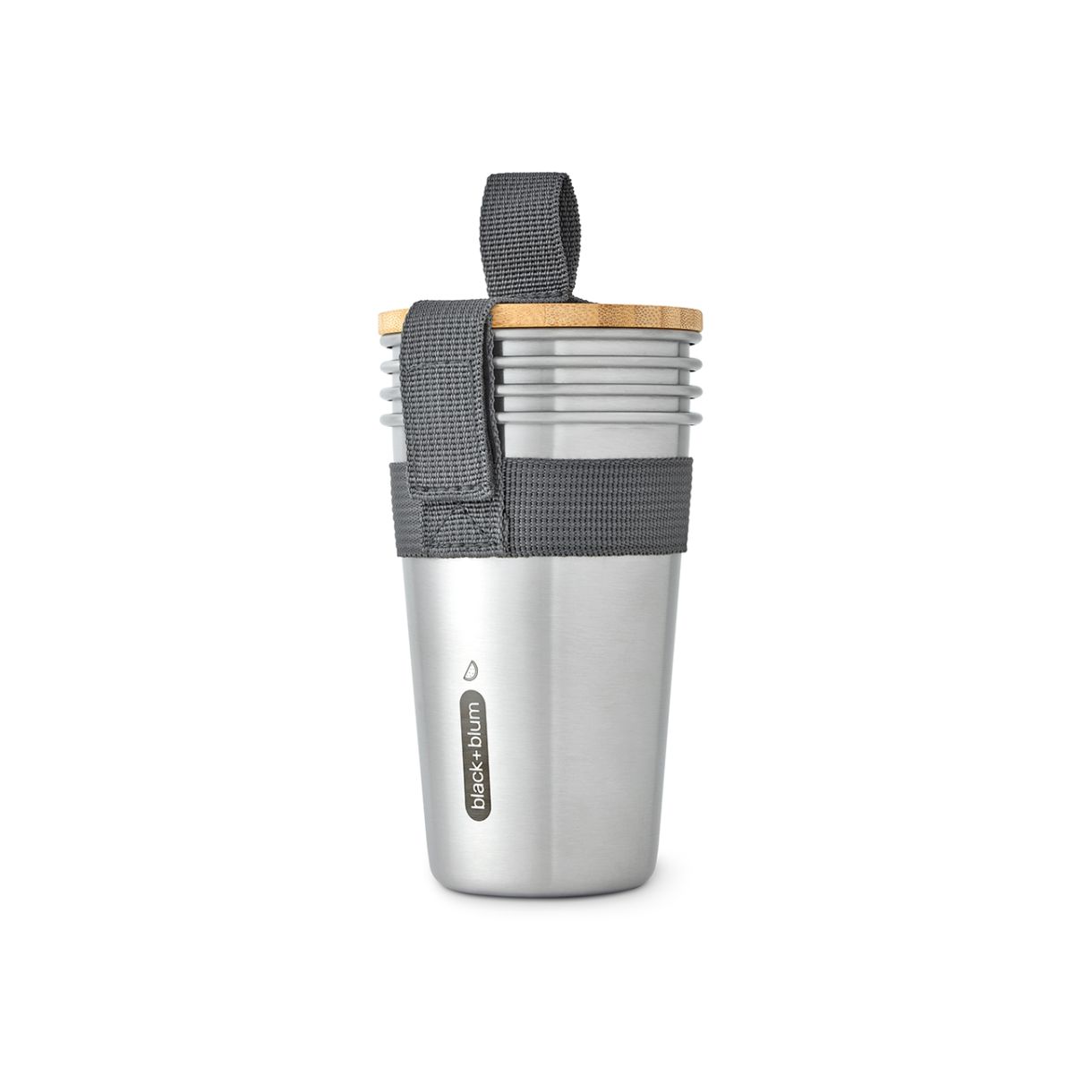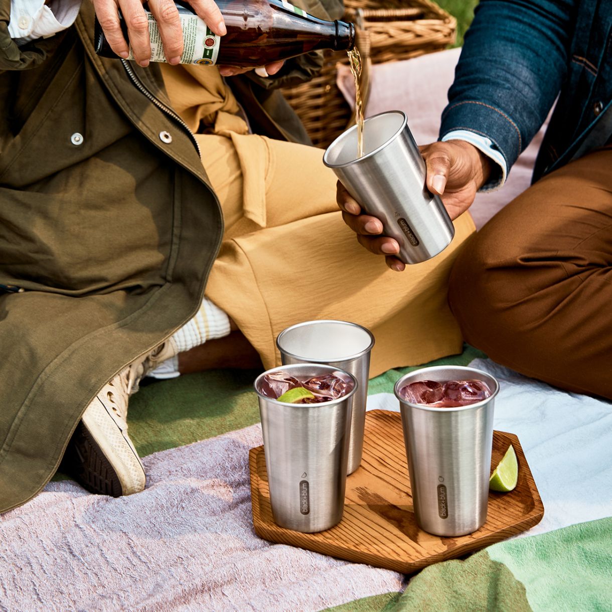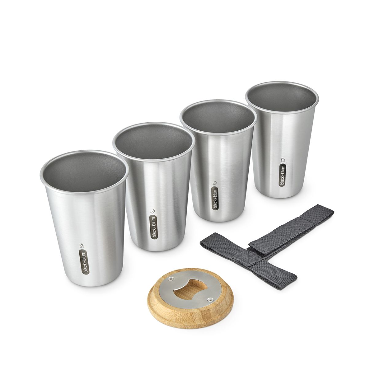 Комплект от 4 леки чаши от неръждаема стомана, които могат да се мият в съдомиялна машина. Всеки комплект е подреден заедно и се предлага с бамбукова мини дъска с вградена отварачка за бутилки, която служи като дъска за рязане, идеална за нарязване на лайм или мента за вашите напитки. Здравата найлонова каишка държи всичко заедно за лесно пренасяне.