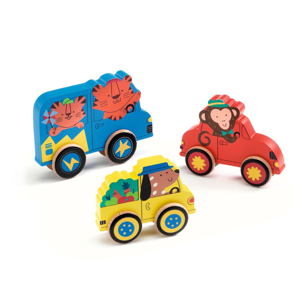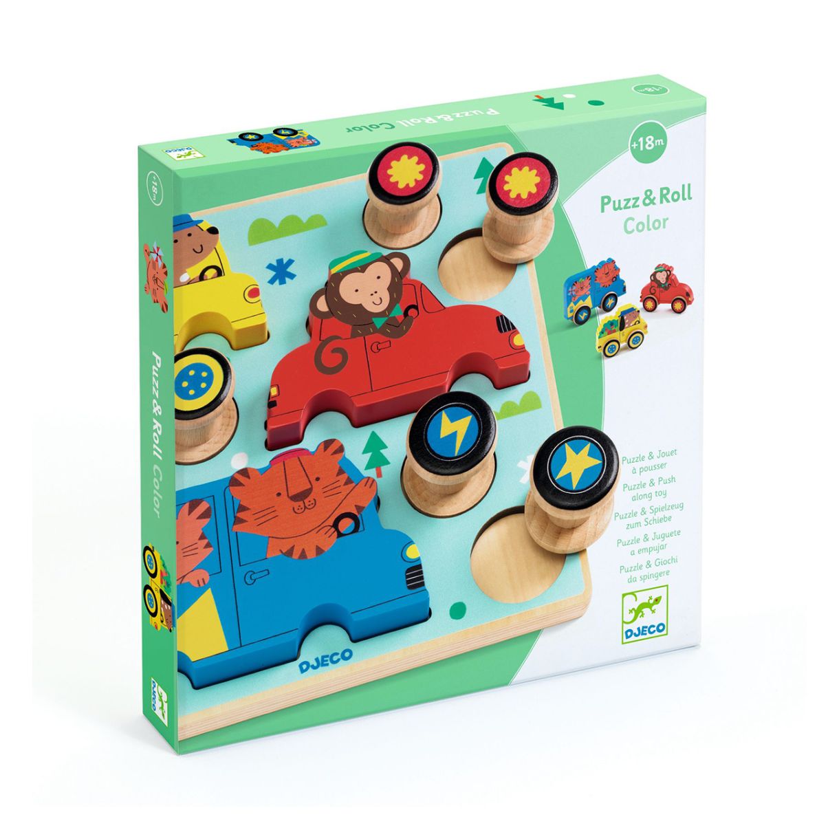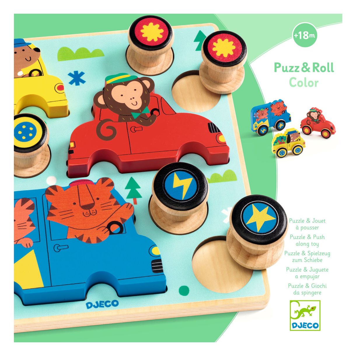 „Пъзел и количка“ е игра 2 в 1: дървен пъзел и играчка с колела. Детето сглобява колелата на животното от един и същи цвят и го търкаля. След това може да постави всичко обратно на основата и да започне отначало!