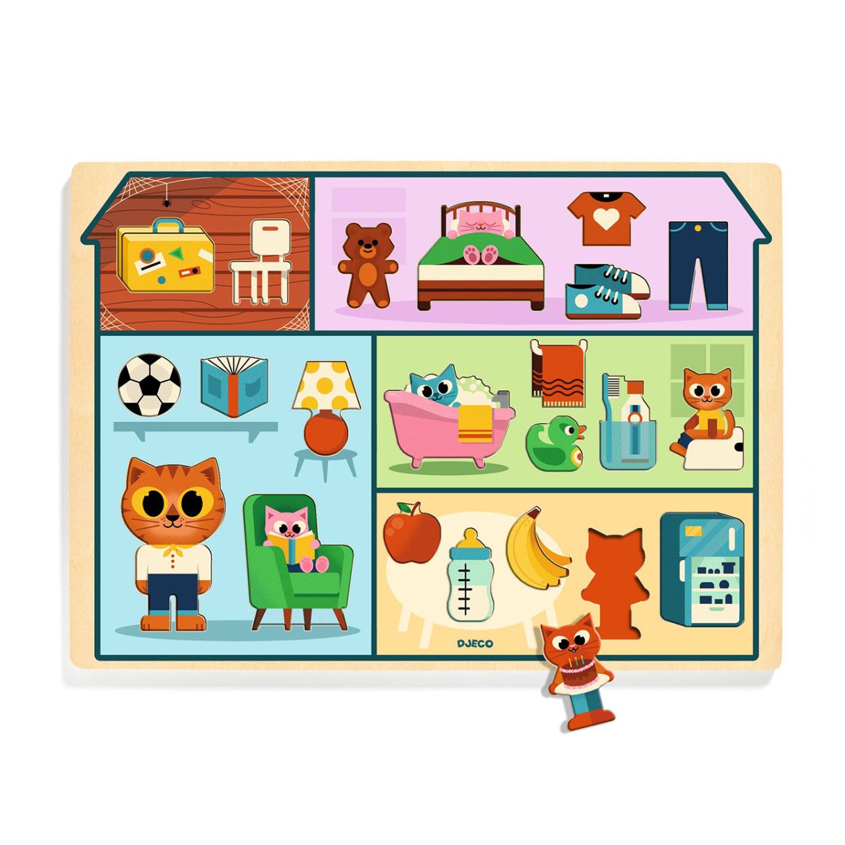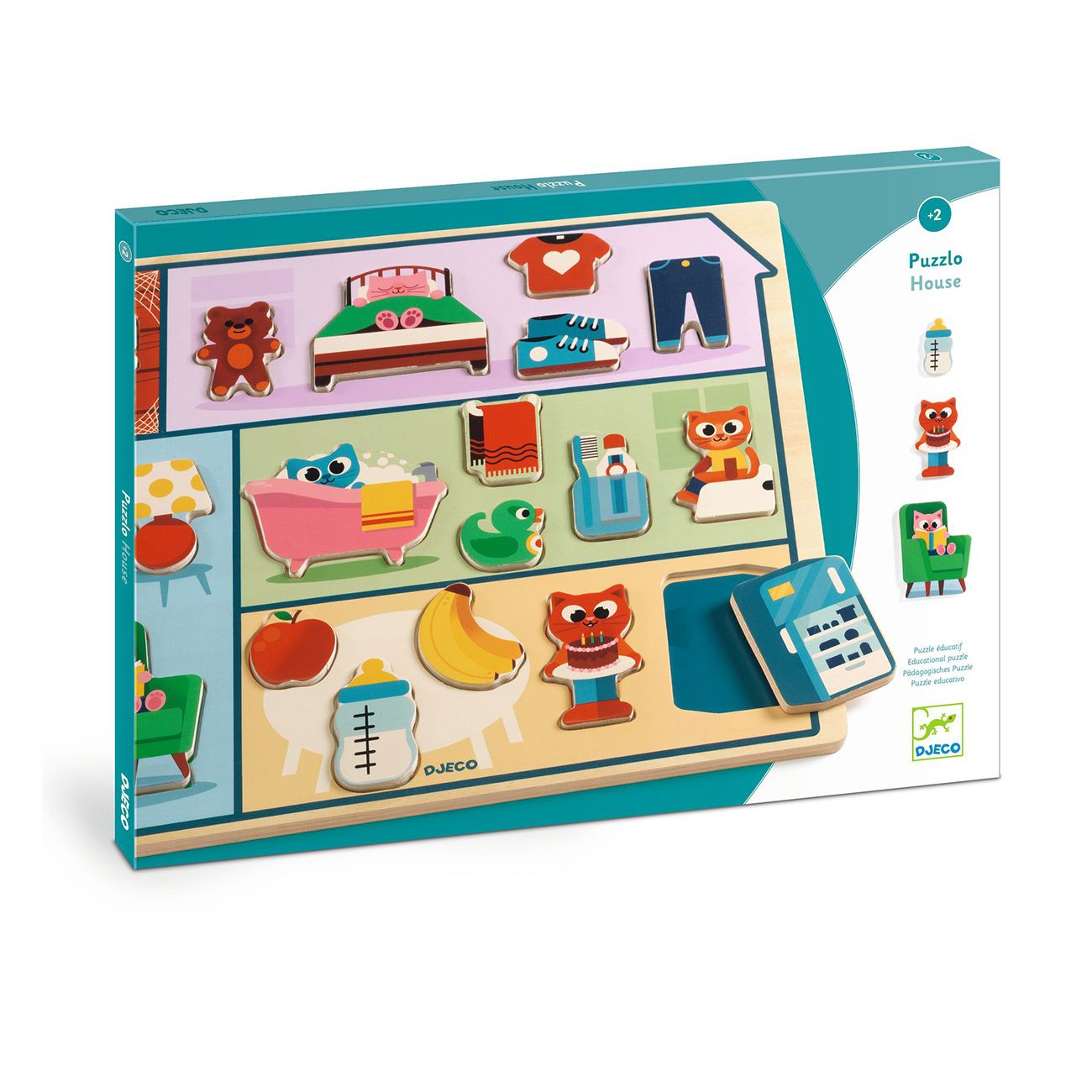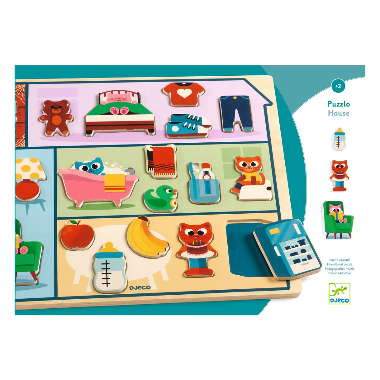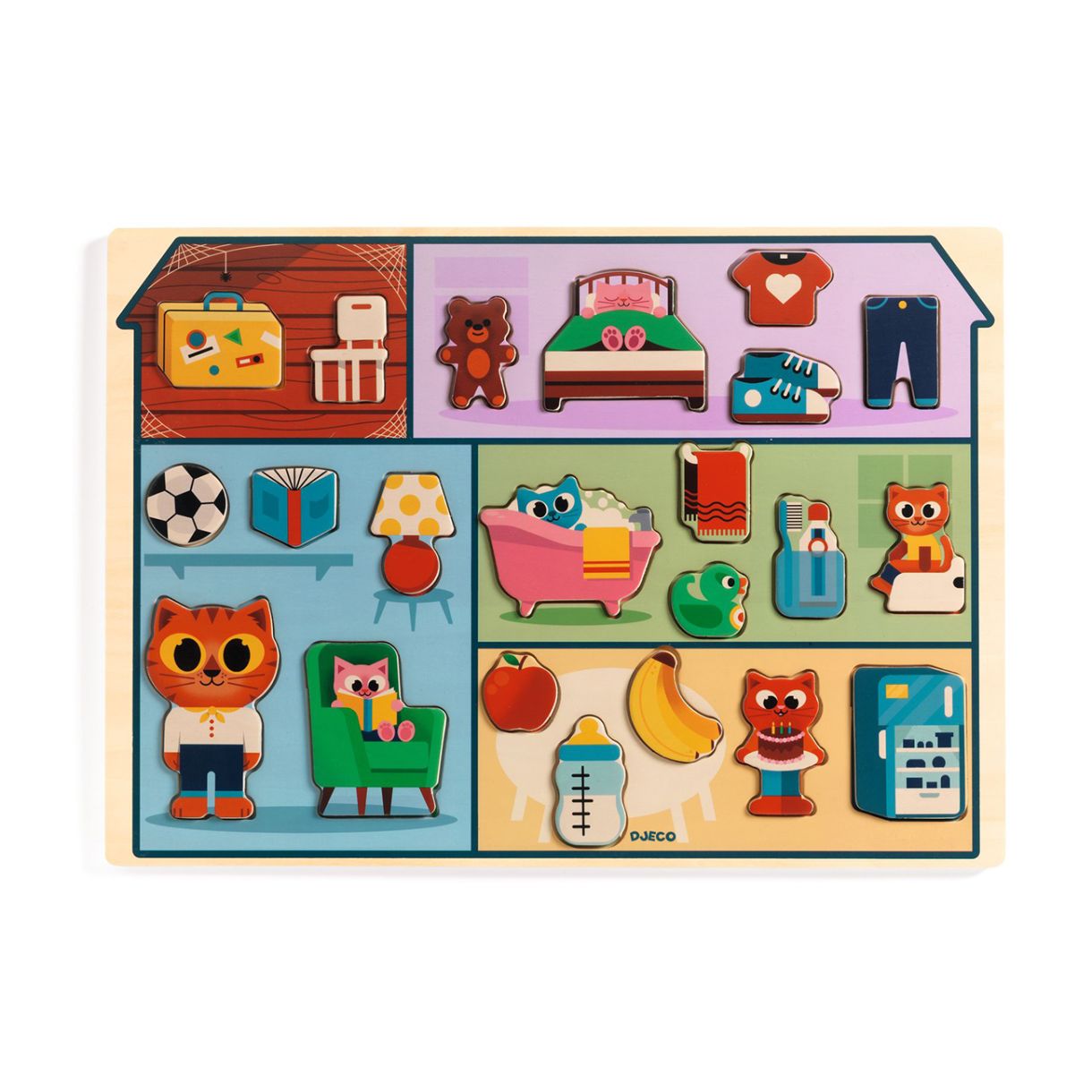 Дървен пъзел с тема къща. Детето сглобява 22-те части, като ги съпоставя със силуетите на познати предмети върху основата.