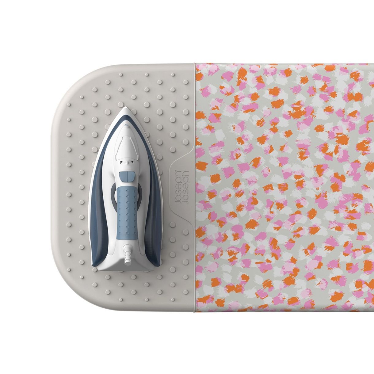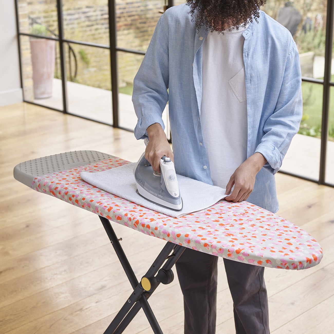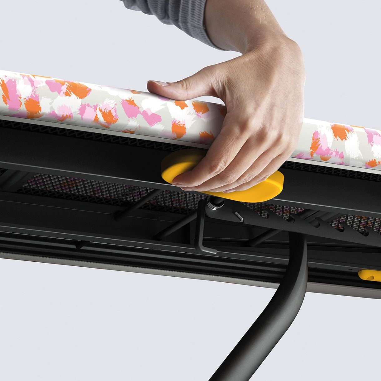 Бърза, лесна настройка и регулиране до седем позиции на височина от 84 см до максимум 99 см. Топлоустойчива силиконова поставка за ютия, интегрирана в калъфа. Включена отделна закачаща кука за лесно съхранение. Лесно сменяем калъф.