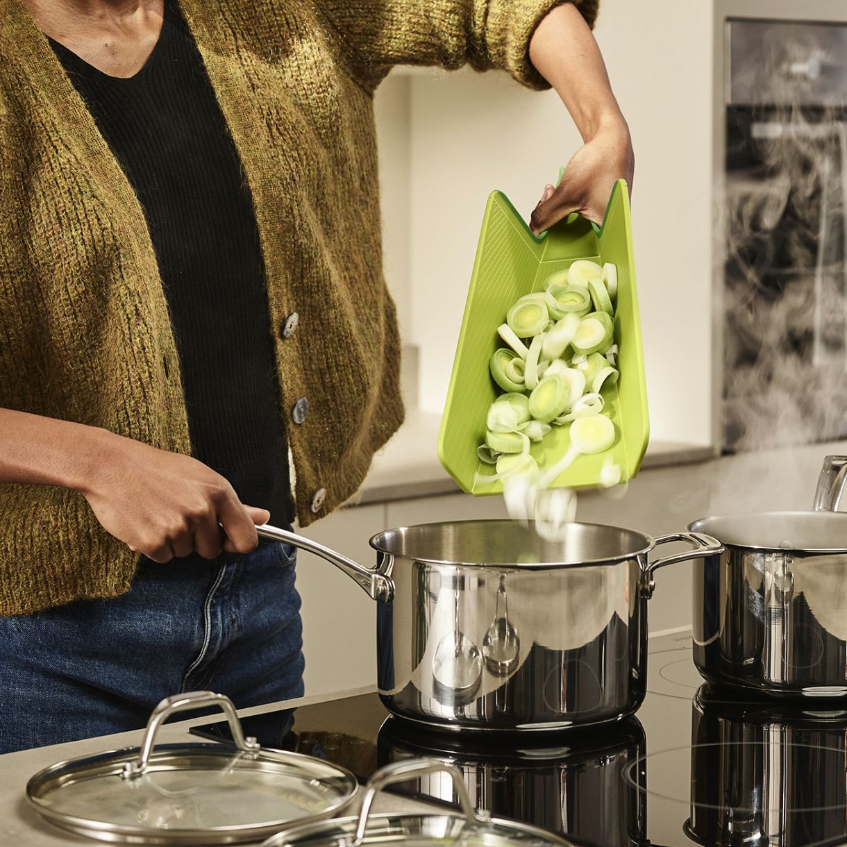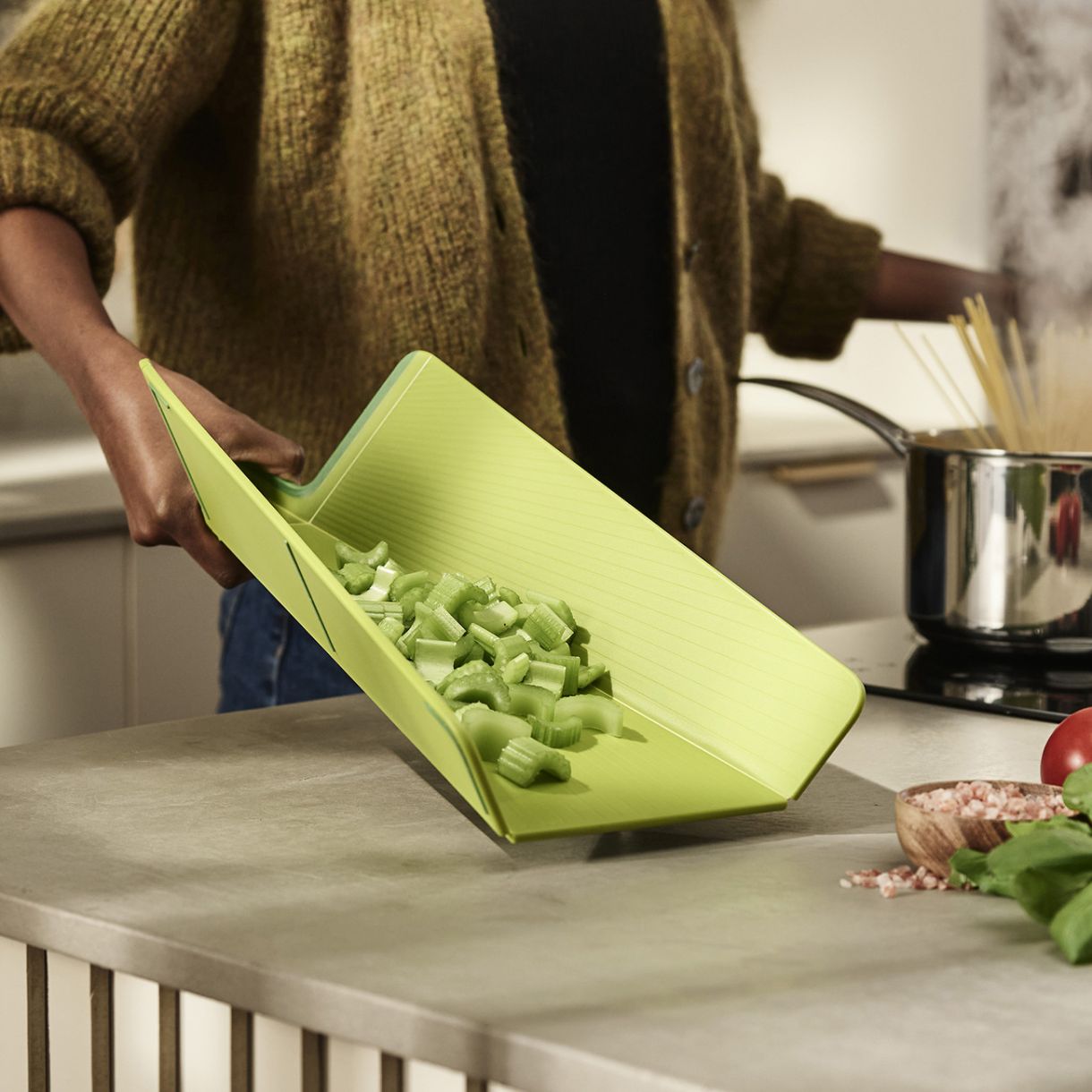 Chop2Pot™ е иновативно решение за прехвърляне на различни нарязани храни в тенджера, тиган или при изхвърляне на обелките в кош за отпадъци.