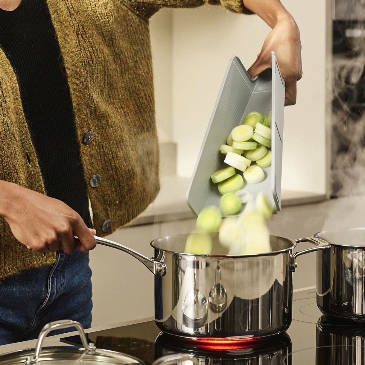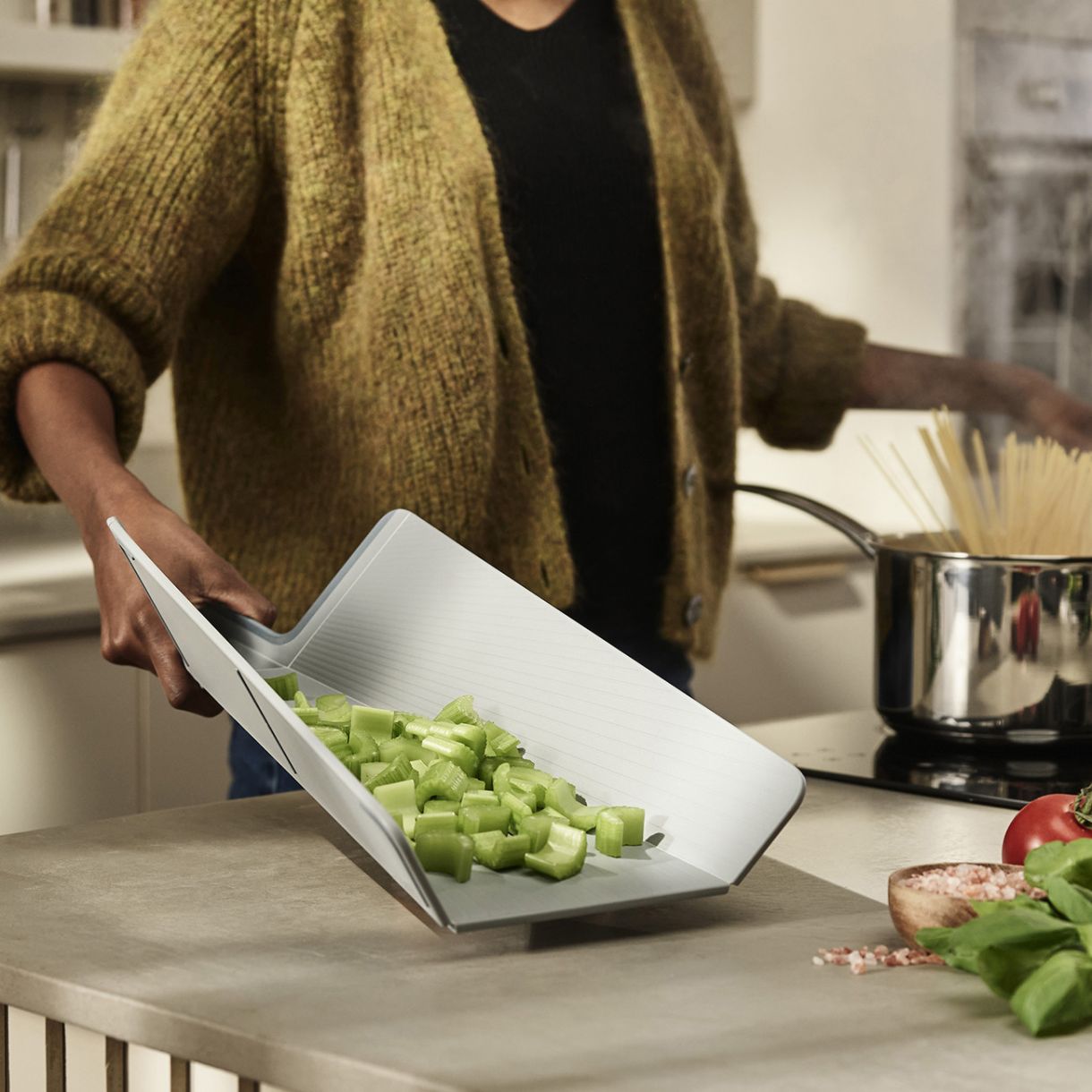 Chop2Pot™ е иновативно решение за прехвърляне на различни нарязани храни в тенджера, тиган или при изхвърляне на обелките в кош за отпадъци.