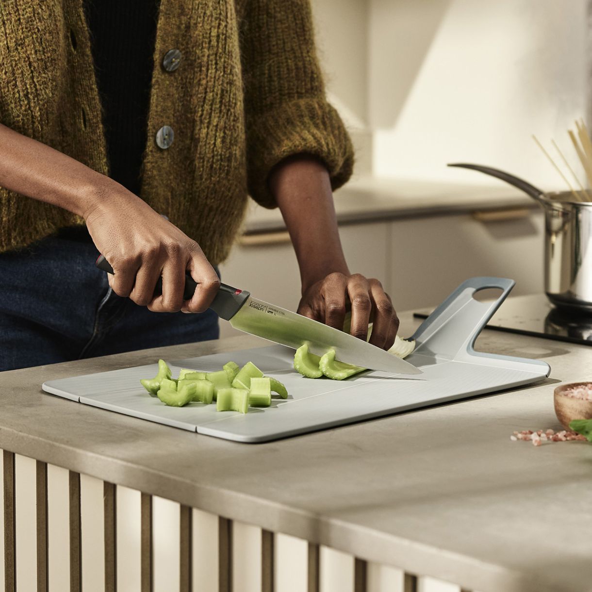 Поставена хоризонтално, дъската има не хлъзгаща се повърхност. С едно натискане на дръжката страните на дъската се сгъват нагоре, за да се създаде улей за лесно изсипване, осигурявайки по-малко бъркотия и по-ефективно приготвяне на храна.