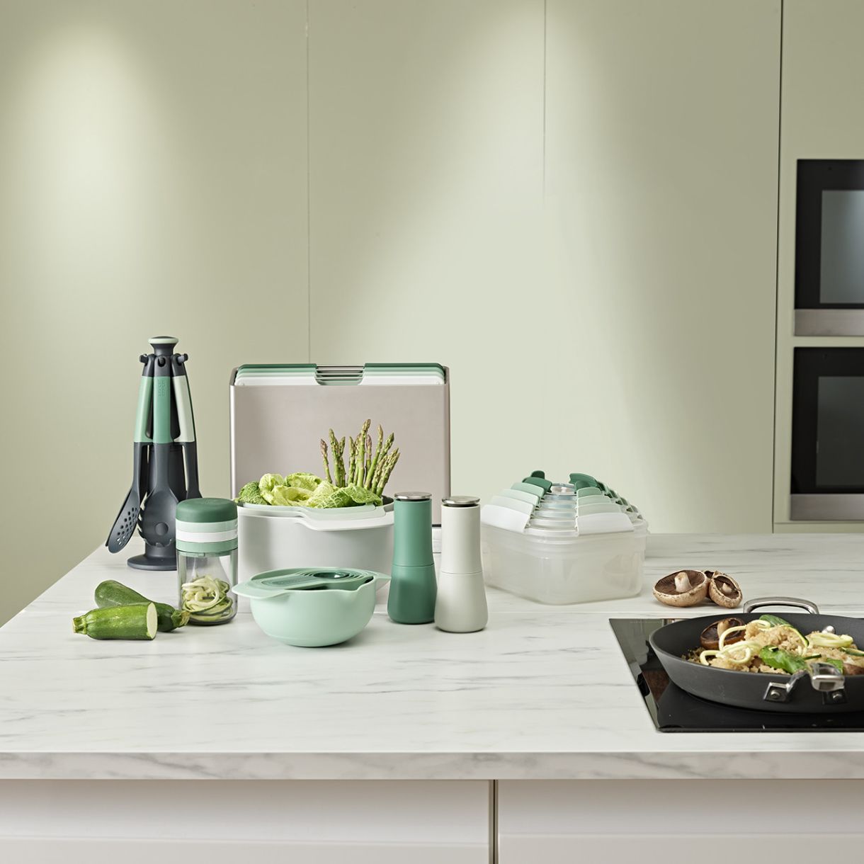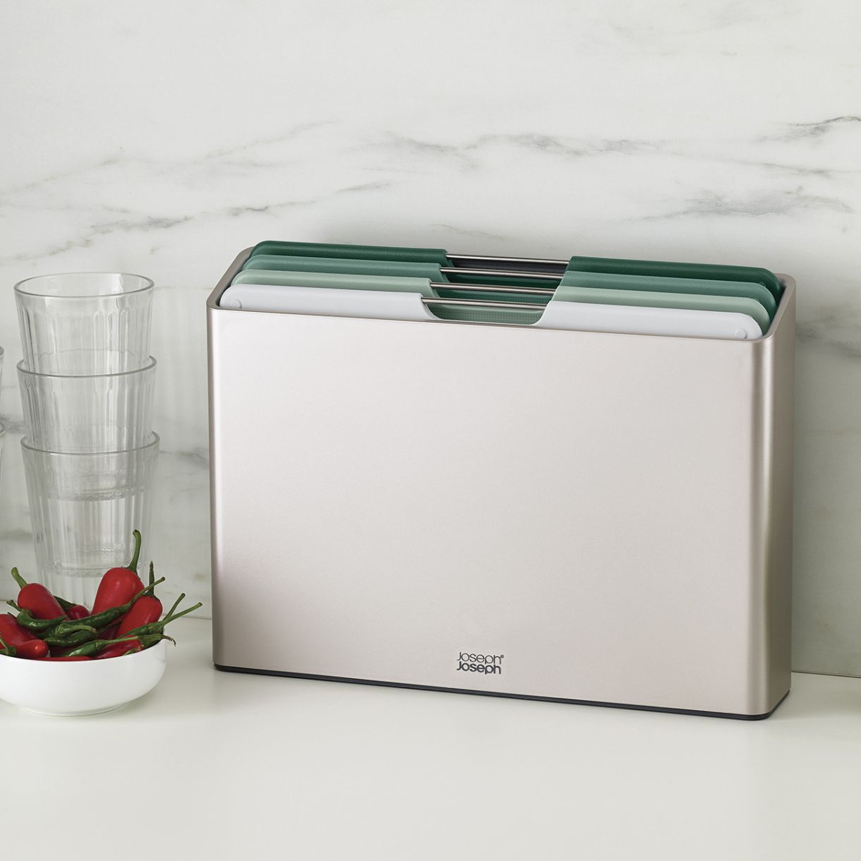 Съхранявайте, всички дъски за рязане, красиво организирани с този елегантен комплект на английската компания Joseph Joseph. Разполага с тънка поставка за съхранение, съдържаща четири големи дъски в различни цветове с текстурирани режещи повърхности от двете страни и не плъзгащи се крачета. Самите дъски могат лесно да бъдат извадени от корпуса, поради интелигентния им дизайн и интегрираните неръждаеми стоманени дръжки. Поставката, държи всяка дъска отделно, като позволява въздуха да циркулира. Има не хлъзгащи се крачета в основата.