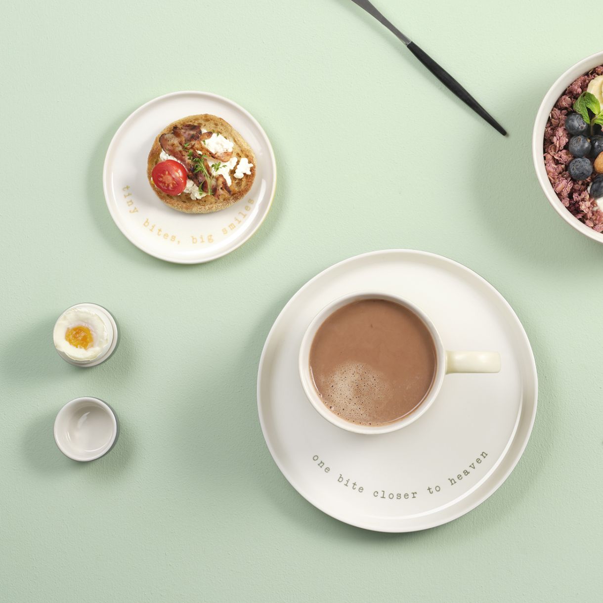 Hey! е топло посрещане на масата за закуска. Всяка част от серията предава свое собствено послание чрез пясъкоструйни надписи и различен цвят. Независимо дали е специален акцент за масата за закуска и кухнята, или като очарователен подарък – Hey! впечатлява със своя дизайн и функционалност.