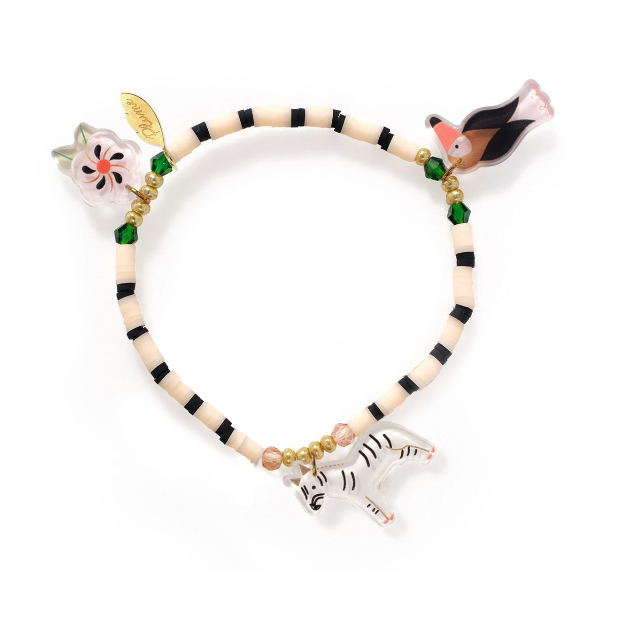 Отправете се на приключение с гривната Jemma, вдъхновена от джунглата. С акрилни мъниста и три талисмана – зебра, цвете и тукан – тя ще добави екзотичен и колоритен акцент към китката ви. Двойната еластична нишка я прави изключително устойчива и лесна за поставяне, без да е необходима закопчалка.