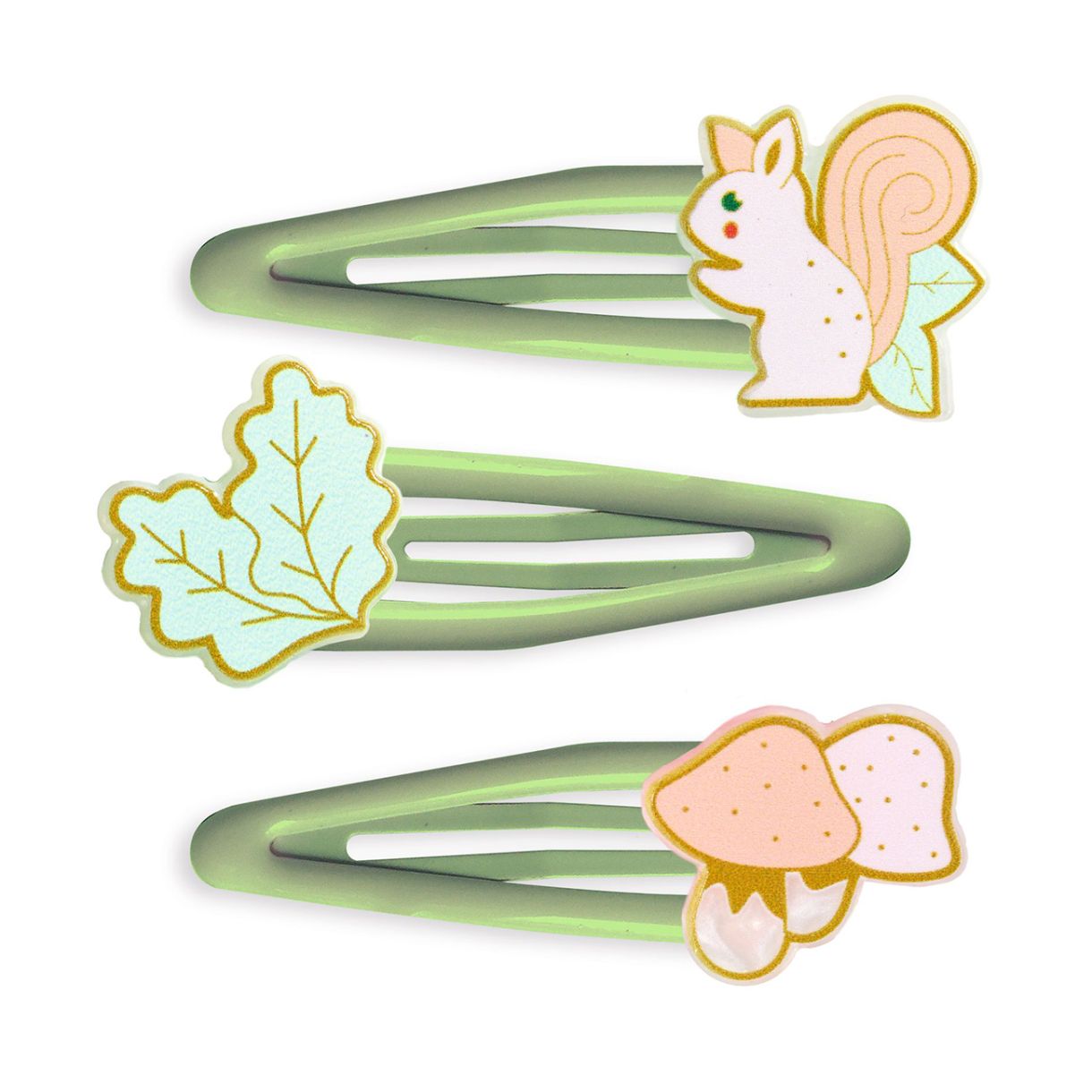 • Комплектът включва три метални фиби с бродерия от плат с изображения на елен, заек и лисица.
