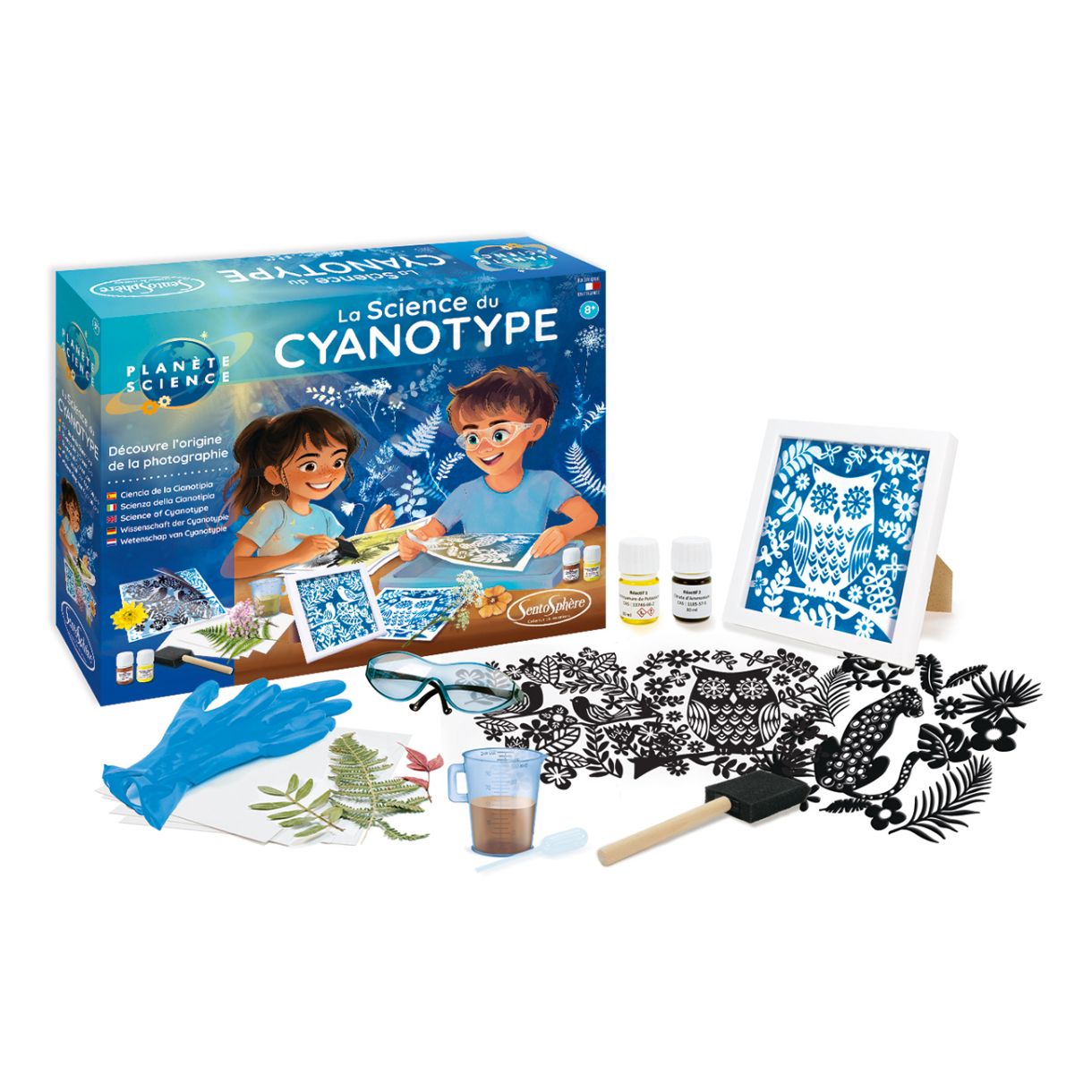 Открийте техниката циано печат с нашата научна кутия, древното изкуство на монохроматичната фотография! Този фотографски процес се извършва със смес, която реагира на светлина и кара експонираните зони да изглеждат в пруски син цвят. Можете да използвате шаблони, предоставени за вашите творения, или да създадете красиви картини със сухи цветя и листа. Предоставените 2 рамки ще ви позволят да покажете най-красивите от вашите творения!
