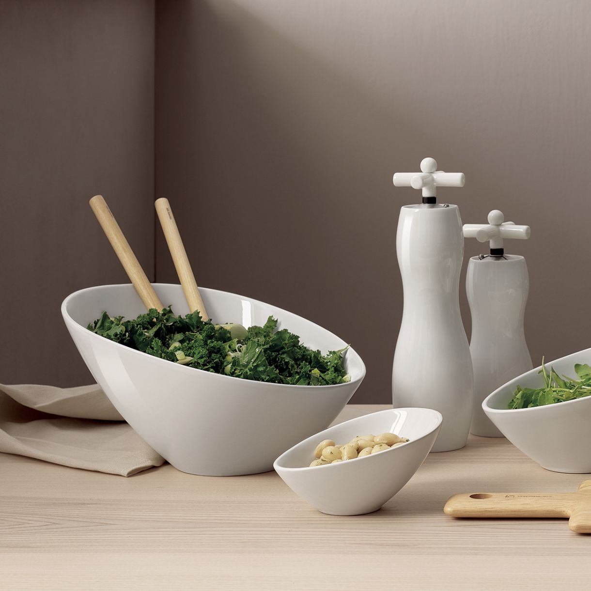 Благодарение на асиметричната си форма, купата Vongole е красиво привличаща вниманието в кухнята или на вашата маса! Използвайте я като фруктиера за плодове, купа за салата или сервирайте хляб. Благодарение на иначе семплата форма и лъскавото бяло, тя визуално се вписва в много серии сервизи.