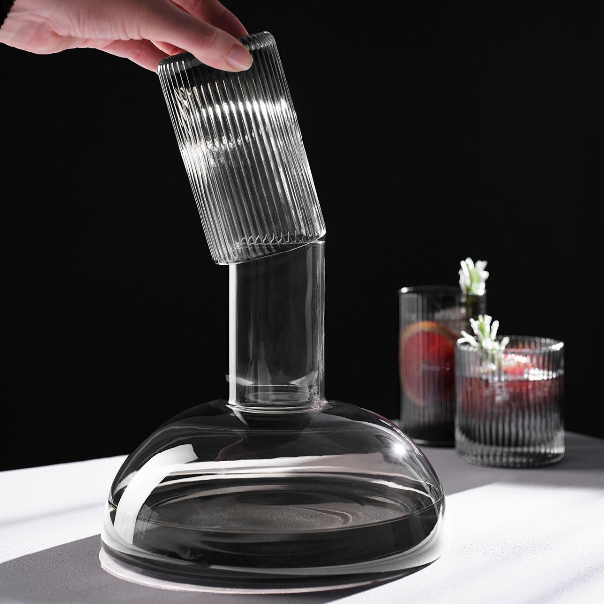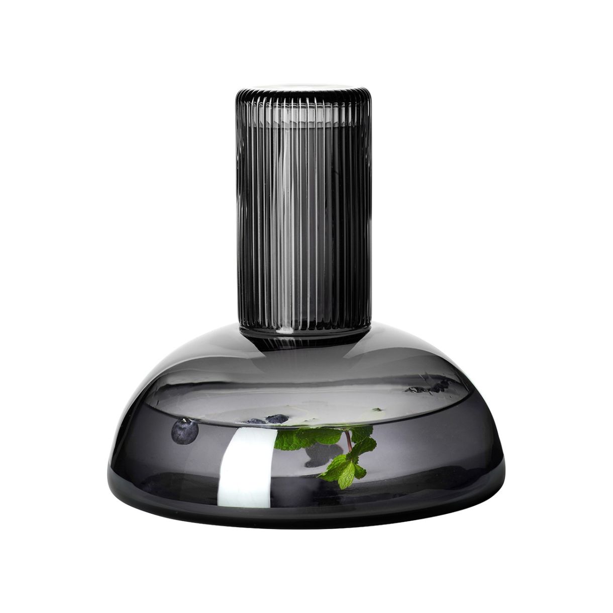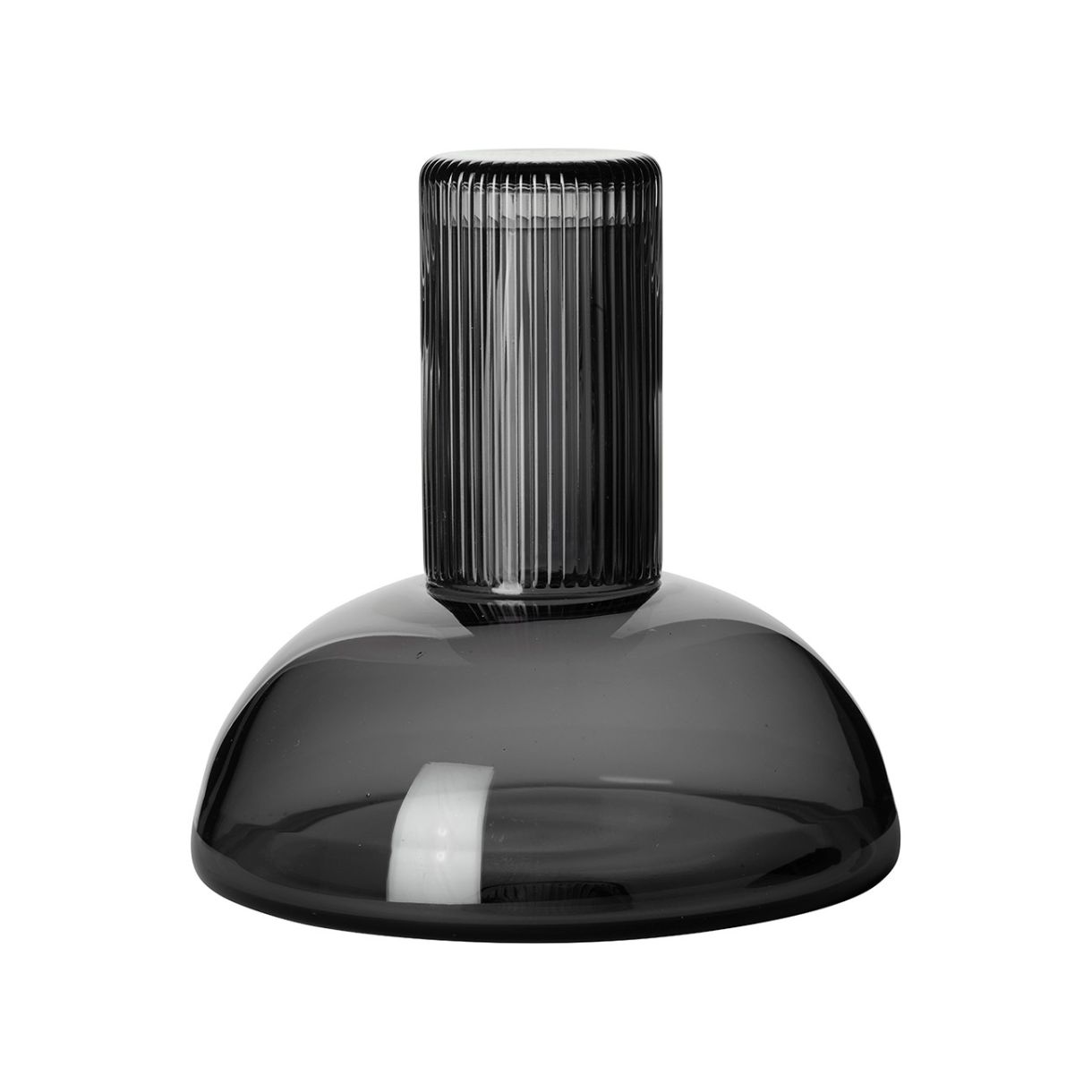Модерна стъклена гарафа от цветно, ръчно духано сиво стъкло. Акцентът на гарафата е затварянето. Обърнатата надолу чаша предпазва съдържанието и неговите аромати, докато стои елегантно върху тънкото гърло на гарафата.