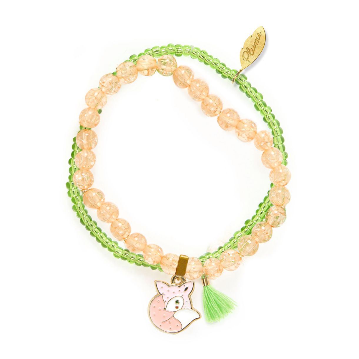 Вдъхновена от гората, гривната Myrtille е ода на природата. Тя се състои от две малки гривни, украсени с висококачествени акрилни мъниста и два емайлирани медальона от неръждаема стомана с лисица и листо. Нежните зелени и златисти детайли ще придадат топлота и стил на китката ви. Усилената двойна еластична нишка я прави изключително издръжлива и лесна за поставяне, без да е необходима закопчалка.