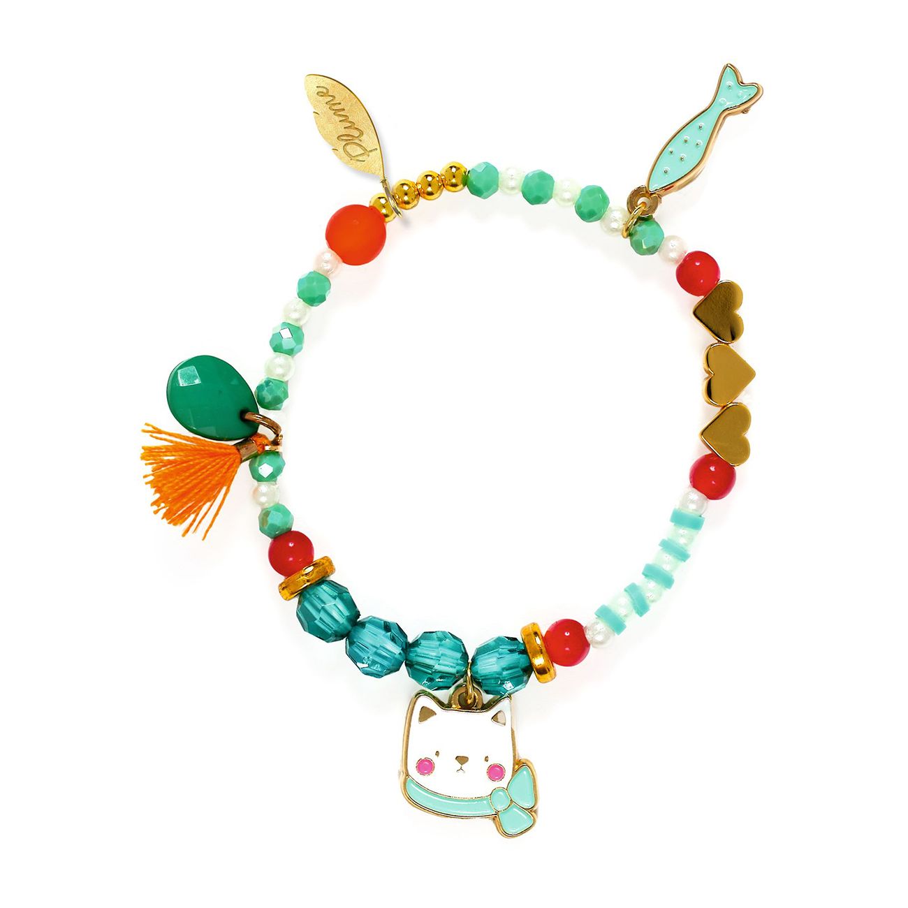 - 1 гривна с акрилни мъниста и 2 различни висулки – емайлирана метална котка и риба – и 1 памучen пискюл.