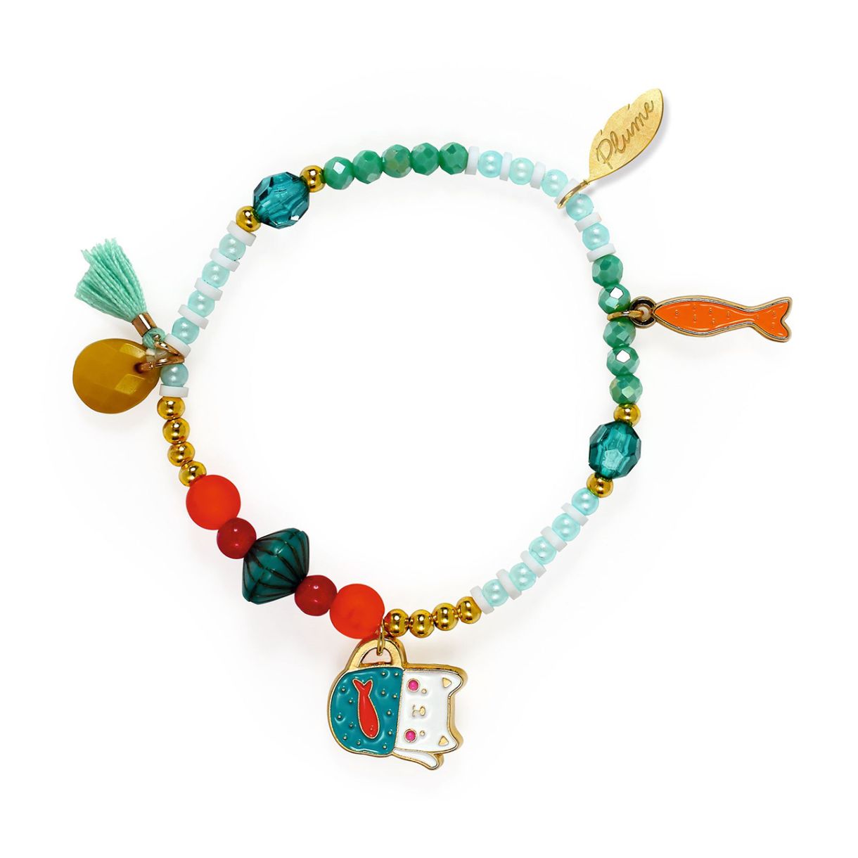 - 1 гривна с акрилни мъниста и 2 различни висулки – емайлирана метална котка и риба – и 1 памучen пискюл.