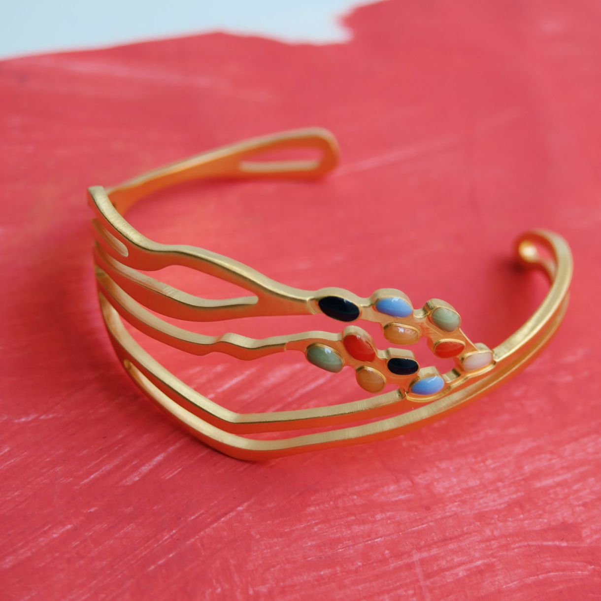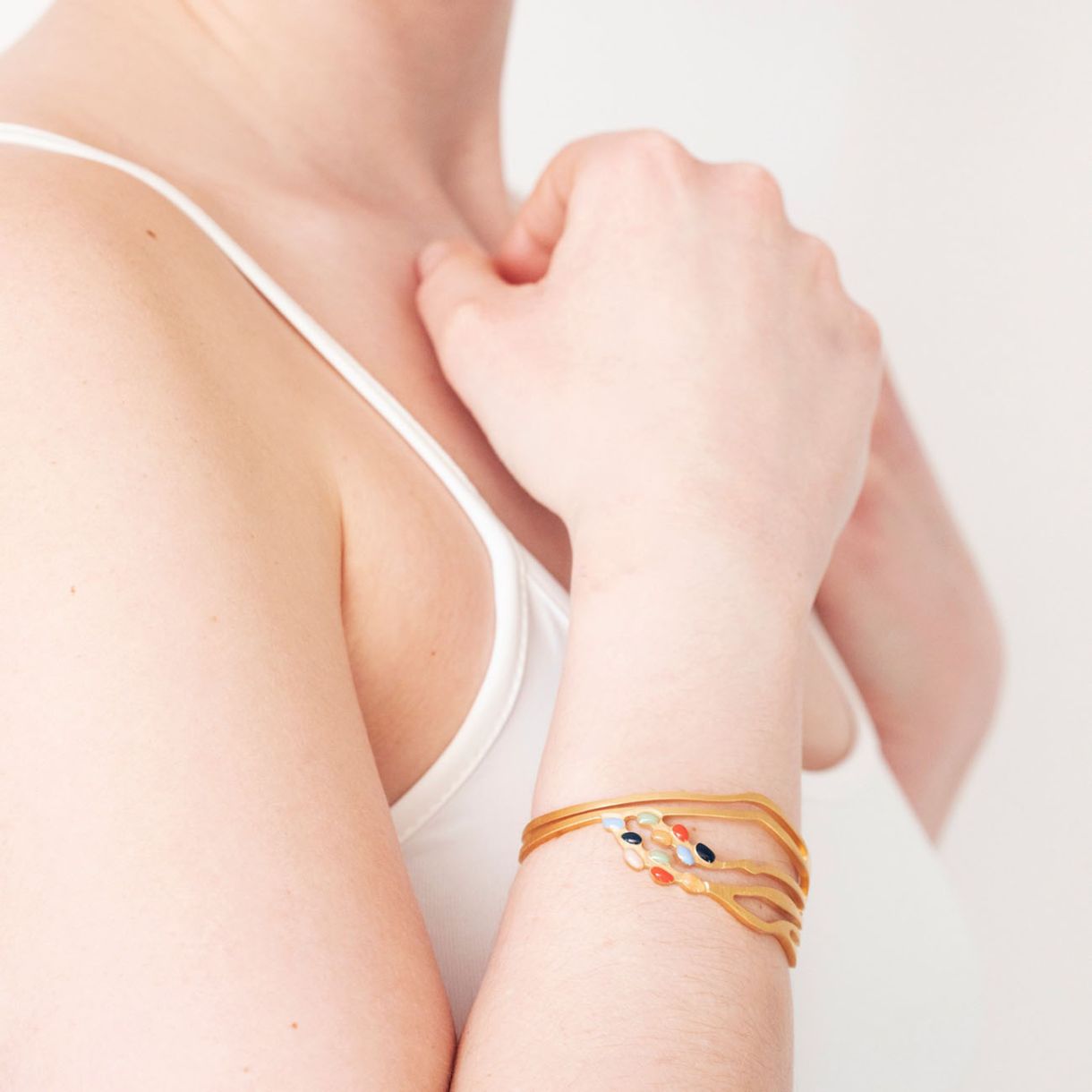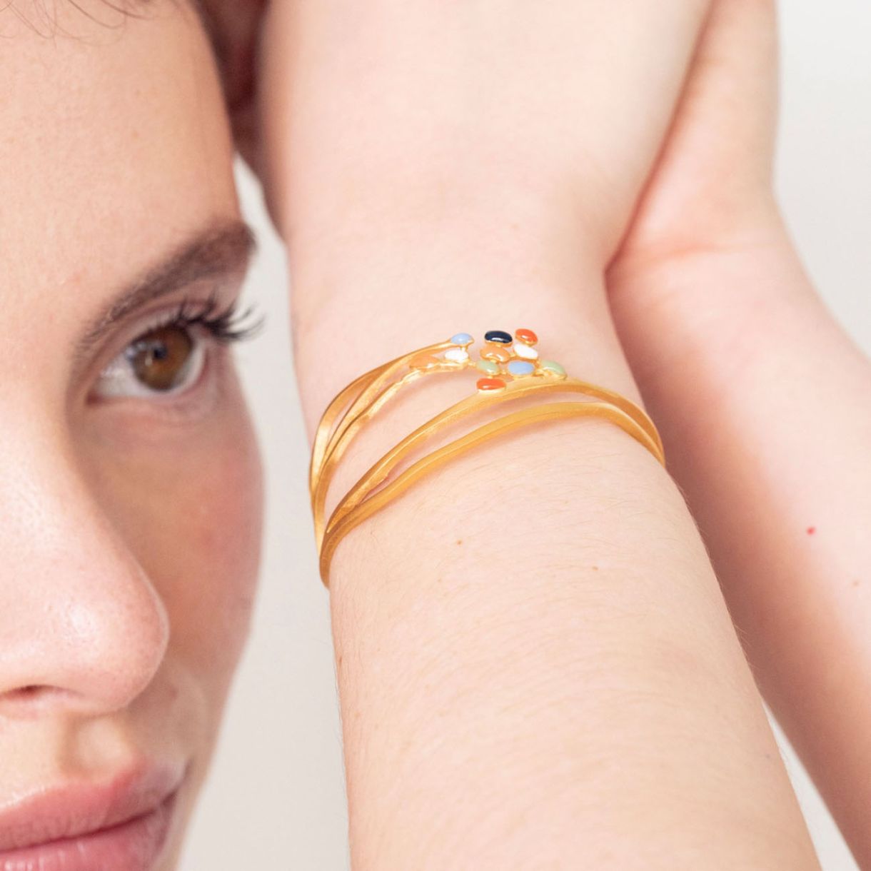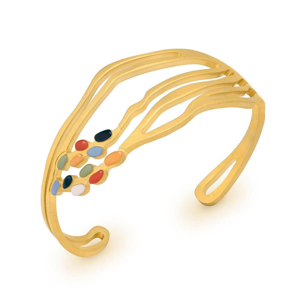 Елегантна отворена гривна с органичен дизайн, част от съвместната работа на Joidart с художничката Àfrica Fanlo. Моделът съчетава лекота на носене със смели цветови акценти, постигнати чрез студен емайл.