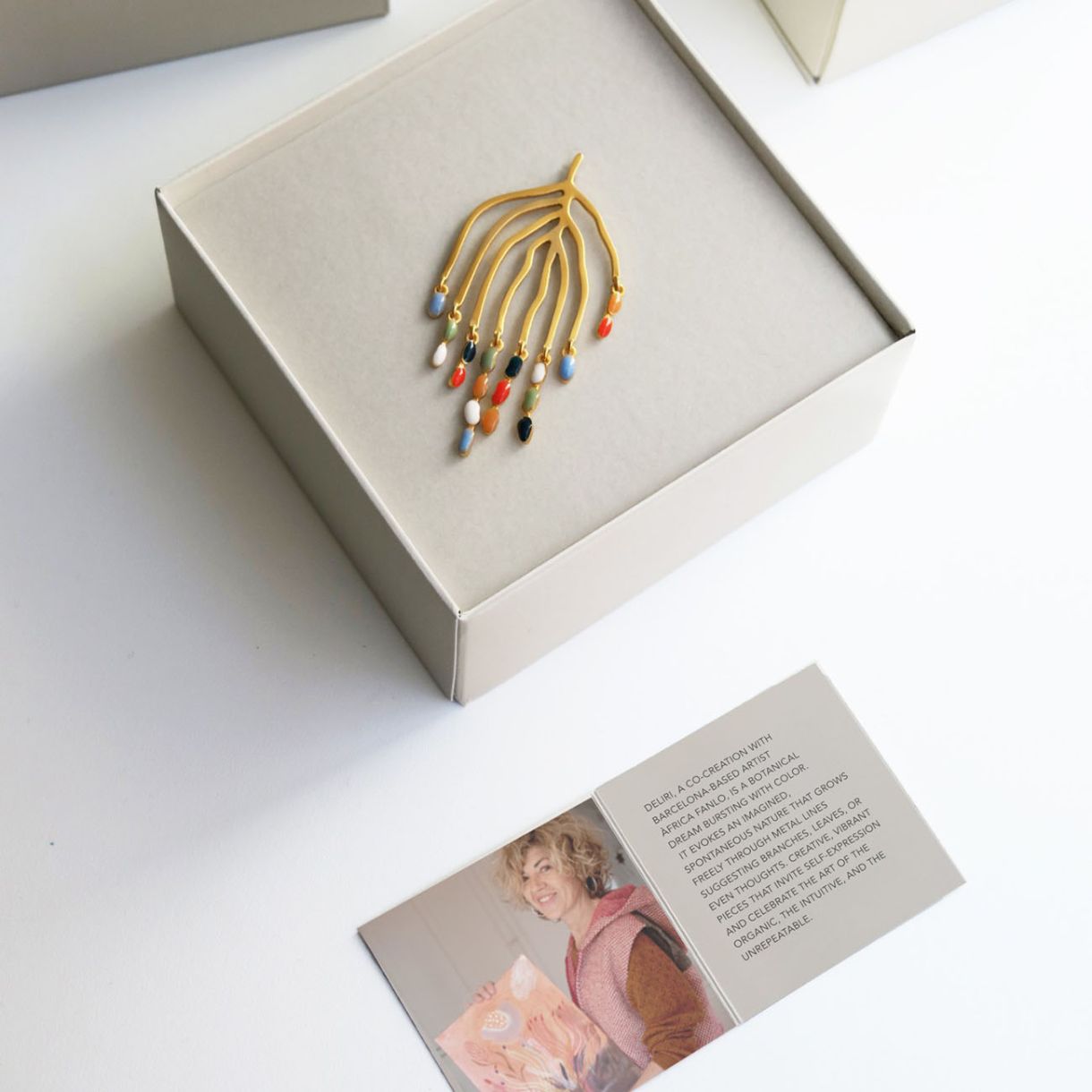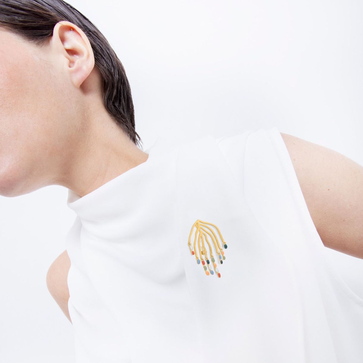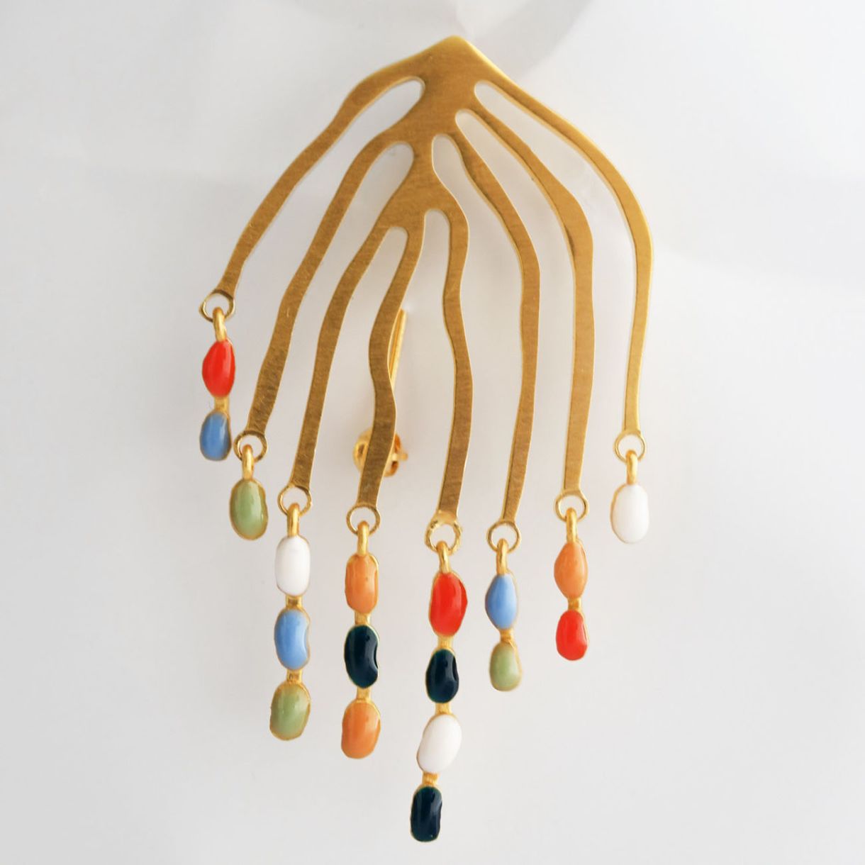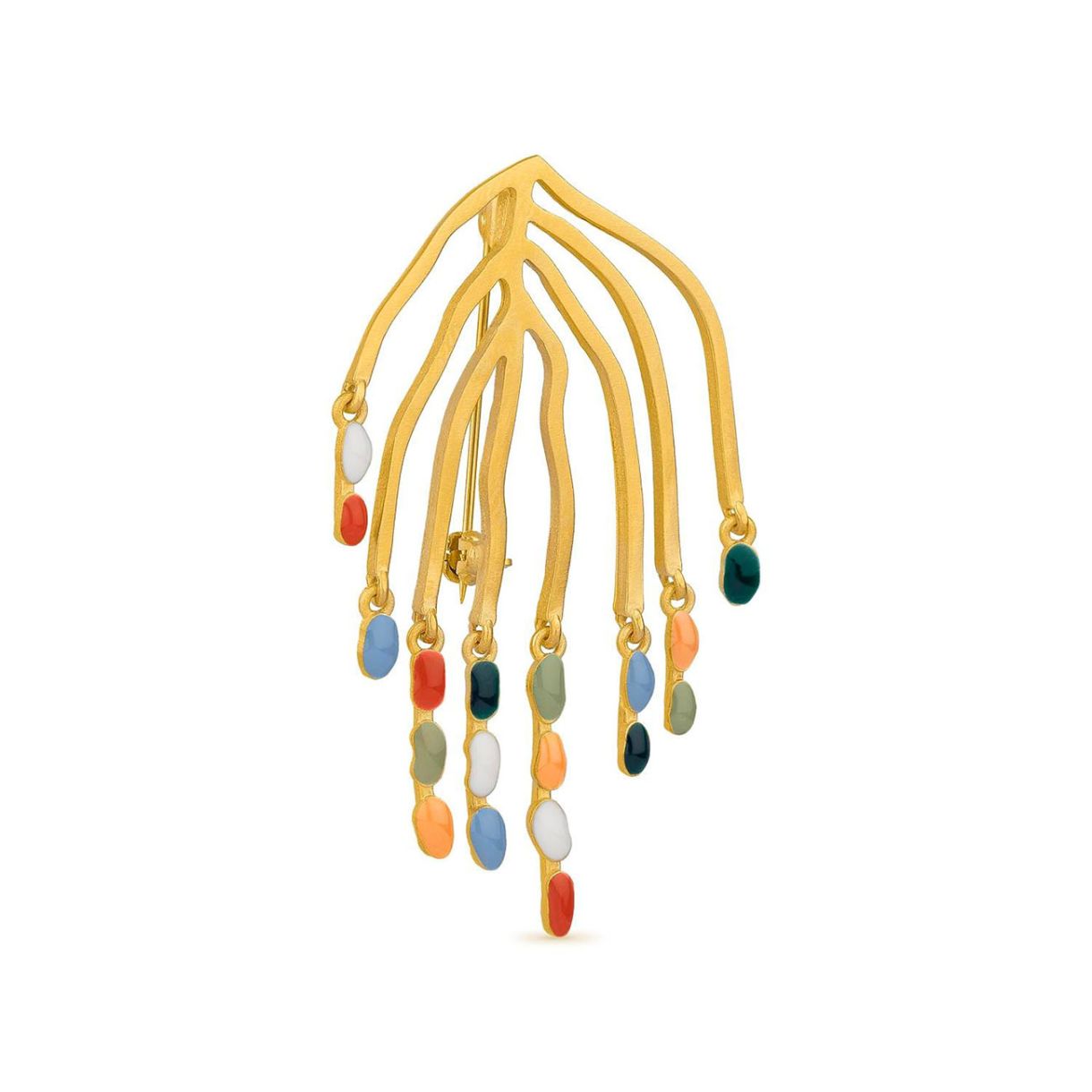 Артистична брошка от колекцията на Àfrica Fanlo, вдъхновена от свободните форми на природата. Дизайнът съчетава класическия блясък на златото с модерната енергия на цветния емайл.