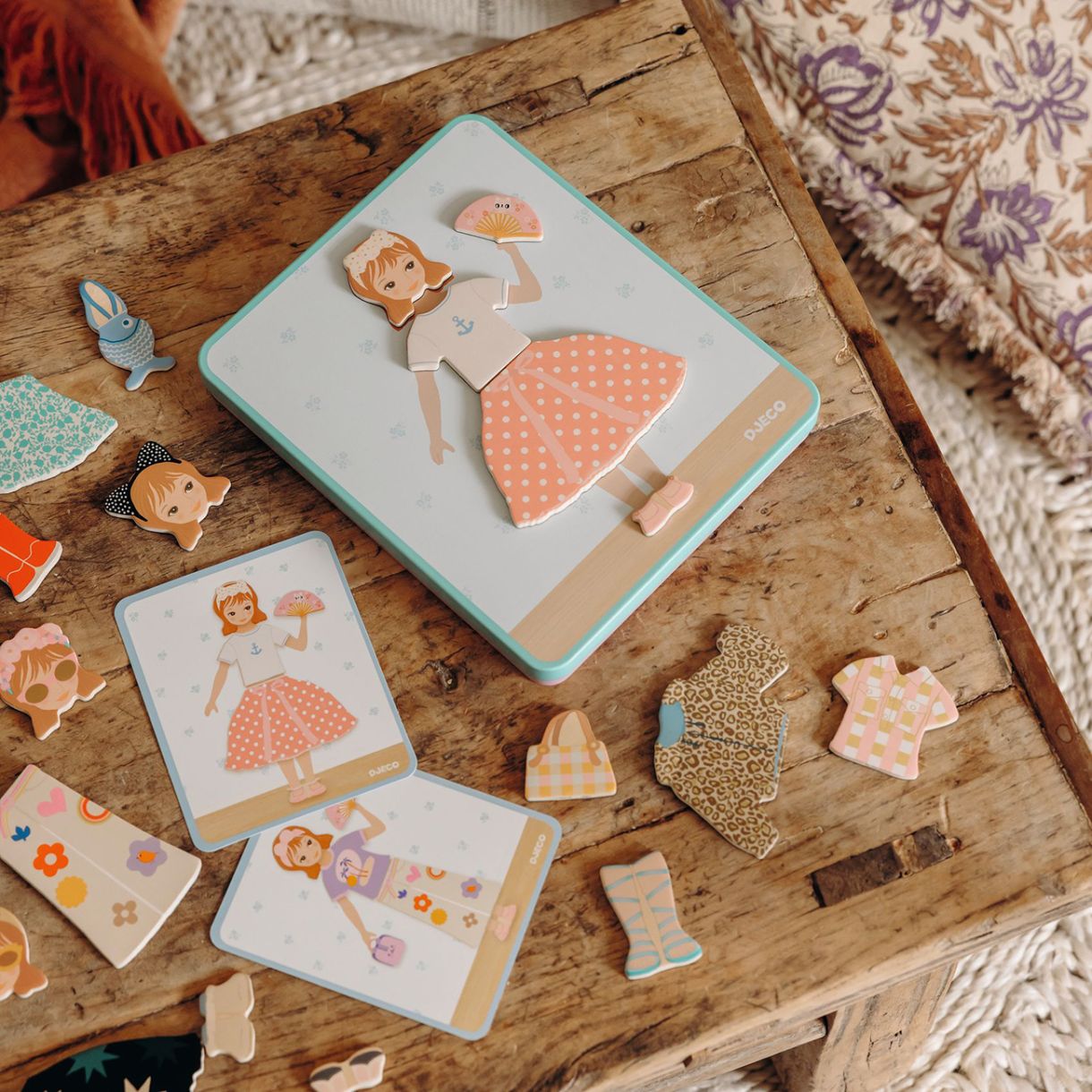Децата играят с дървени магнити върху тънка метална кутия. Те пресъздават 12-те тоалета, показани на картите, като избират дясната страна на кутията.