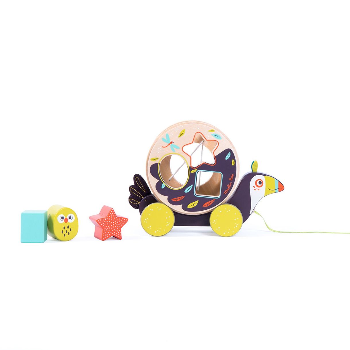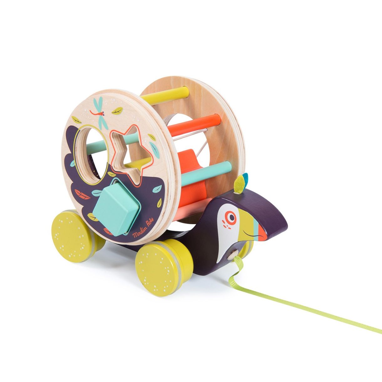Дървена кутия с форма на тукан с много цветове и илюстрации. Разполага с три геометрични фигури, които се закрепват, и звънче, което издава звук, когато колелото се завърти. Развива двигателните умения на децата и ги учи на форми и цветове.