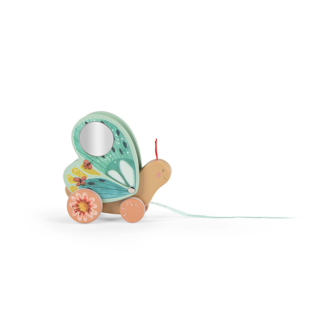 Цветна, илюстрирана дървена пеперуда за дърпане от колекцията "Три малки . В коремчето ѝ има звънче, което издава звук, а крилата ѝ се размахват, докато пеперудата се движи напред! Тази играчка за дърпане с панделка насърчава децата да развиват двигателните си умения.