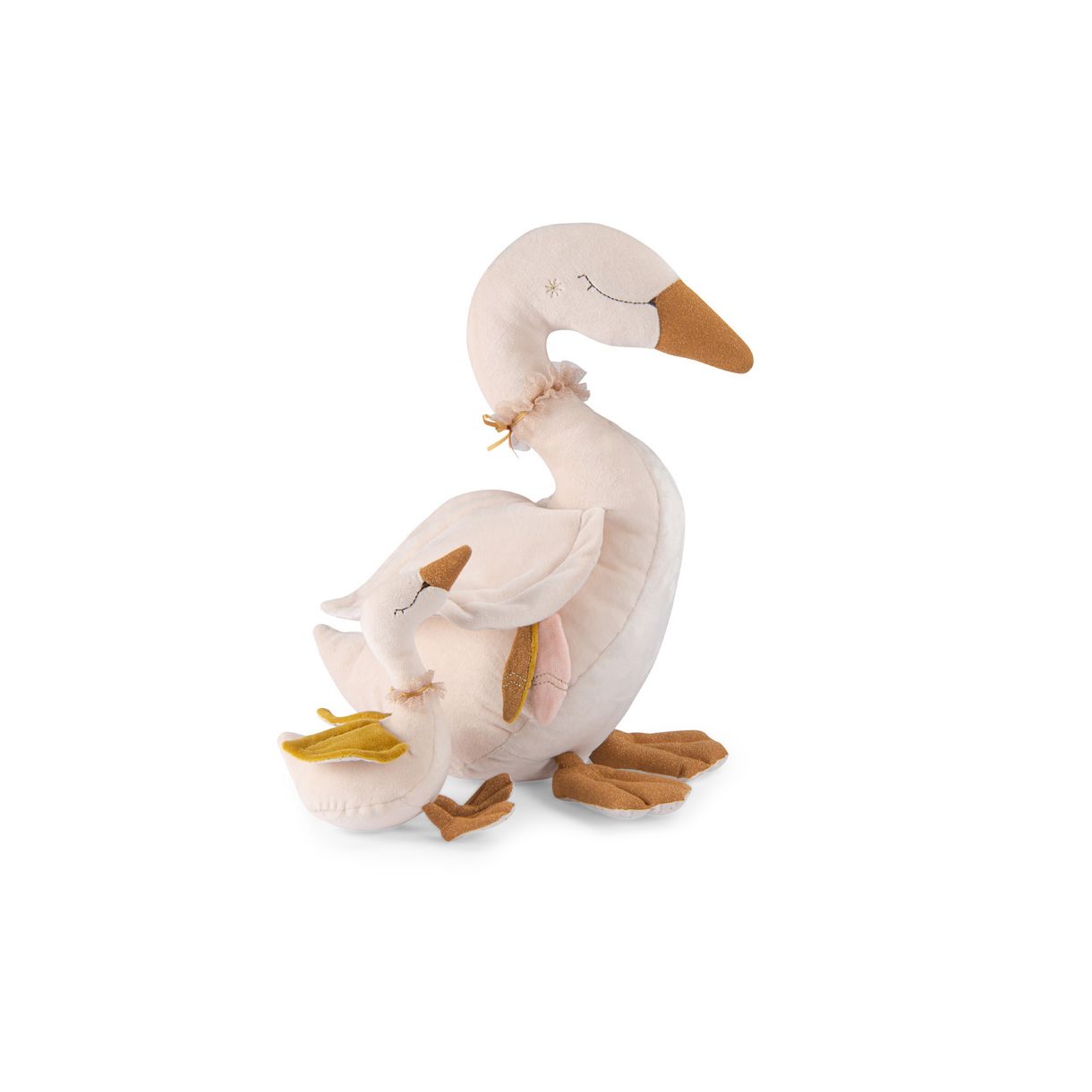 Кадифеният лебед е меко и поетично допълнение към спалнята на бебето. Яката му от тюл, златният клюн и бродираните детайли му придават величествен вид. Върху него са скрити малки топчета, пищялки и шумоляща хартия, които да развиват бебето.