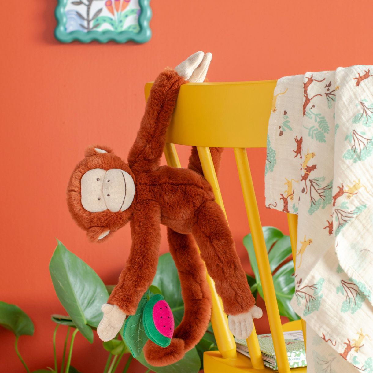 Запознайте се с Мочика – палавото маймунче с множество забавни активности! С различни звуци и текстури: звънче, дрънкалки и шумолящо листо – маймунката стимулира сетивата и любопитството на бебето още от първите месеци. Благодарение на велкро закопчалките, играчката може лесно да се закачи навсякъде – където пожелаете. Изключително меко и приятно за гушкане, това маймунче е идеалният спътник в ежедневните разходки и игри. Подходящо за закачане на количка, активна гимнастика или кошара, то предлага истинско сетивно приключение с цветове, звуци и различни материи.