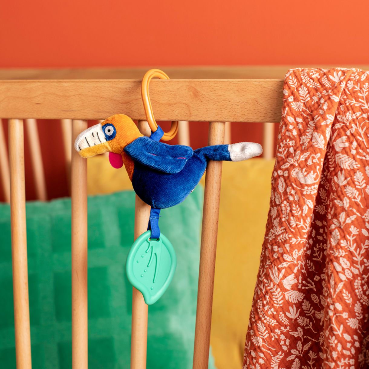 Запознайте се с цветния тукан с активности от колекцията горатa Мава на Moulin Roty – мека играчка за окачване, създадена да забавлява и стимулира сетивата на бебето още от първите му месеци. Ярките цветове и интерактивните елементи приканват към докосване, разклащане и изследване. В коремчето си той крие дрънкалка, а шумолящите крилца добавят още забавление и сетивни открития. Към играчката е прикрепена и гризалка във формата на листа, която помага за облекчаване на дискомфорта при никнене на зъбките. Тукана с активности лесно се закача за количка, активна гимнастика или кошара и ще бъде верен спътник на бебето в ежедневните игри у дома и навън.