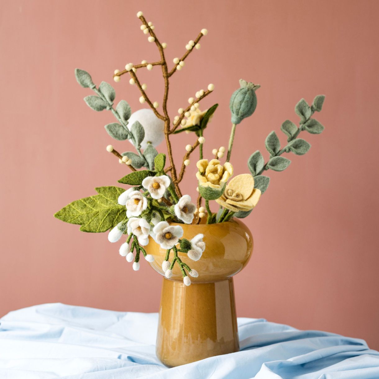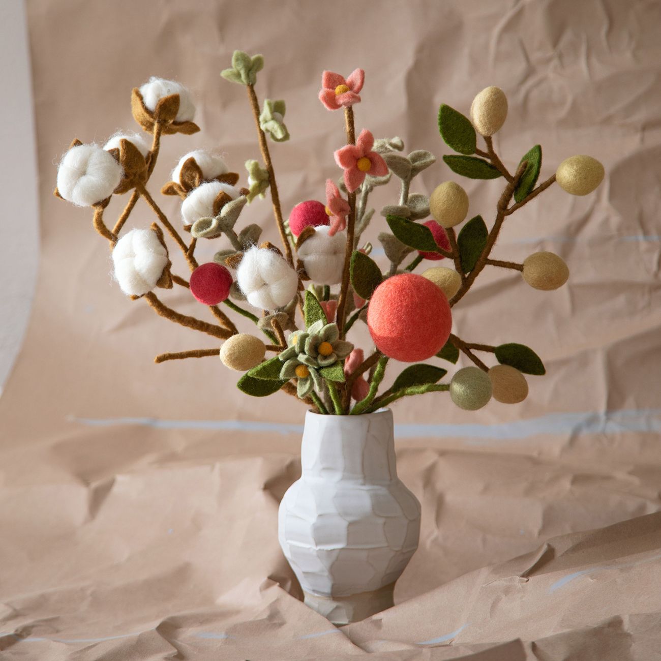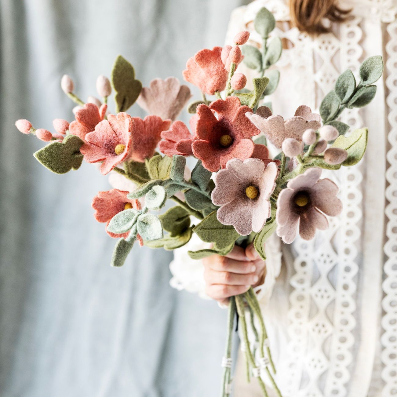 Пътешествието започва с кардирането на вълната до мека текстура. С топла сапунена вода вълната се търка нежно и се оформя, за да се свържат влакната и да се създаде здрав филцов материал. Докато влажната вълна се разтяга, тя внимателно се оформя в желаната фигурка - било то сладко зайче или любопитна мишка. След това фигурката се суши под горещото непалско слънце. След като желаната форма е създадена, започва най-детайлната и артистична стъпка: добавянето на бродерия и декоративни детайли.