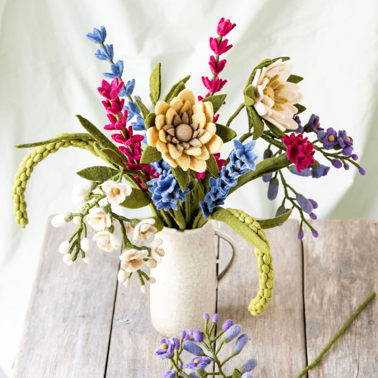 Пътешествието започва с кардирането на вълната до мека текстура. С топла сапунена вода вълната се търка нежно и се оформя, за да се свържат влакната и да се създаде здрав филцов материал. Докато влажната вълна се разтяга, тя внимателно се оформя в желаната фигурка - било то сладко зайче или любопитна мишка. След това фигурката се суши под горещото непалско слънце. След като желаната форма е създадена, започва най-детайлната и артистична стъпка: добавянето на бродерия и декоративни детайли.
