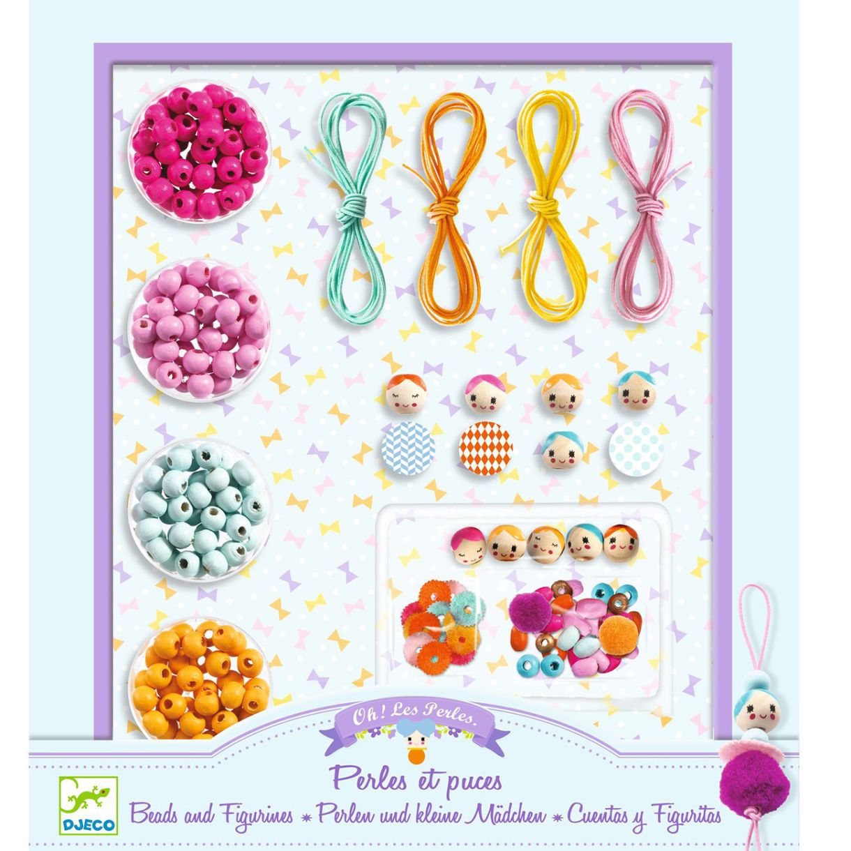 Комплект „Мъниста и фигурки“ е пълен с дървени мъниста и аксесоари, които са идеални за изработване на красиви бижута. Мънистата се предлагат във всякакви цветове и са внимателно проектирани, за да дават красиви резултати всеки път. Децата нанизват мънистата и аксесоарите върху връвта, създавайки красиви колиета, гривни и талисмани. Идеален за творчески подарък за момиче.