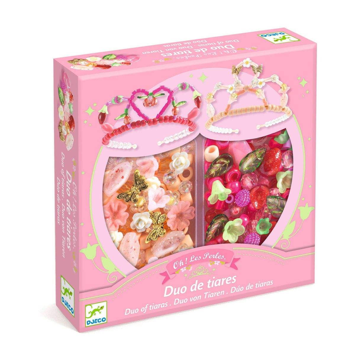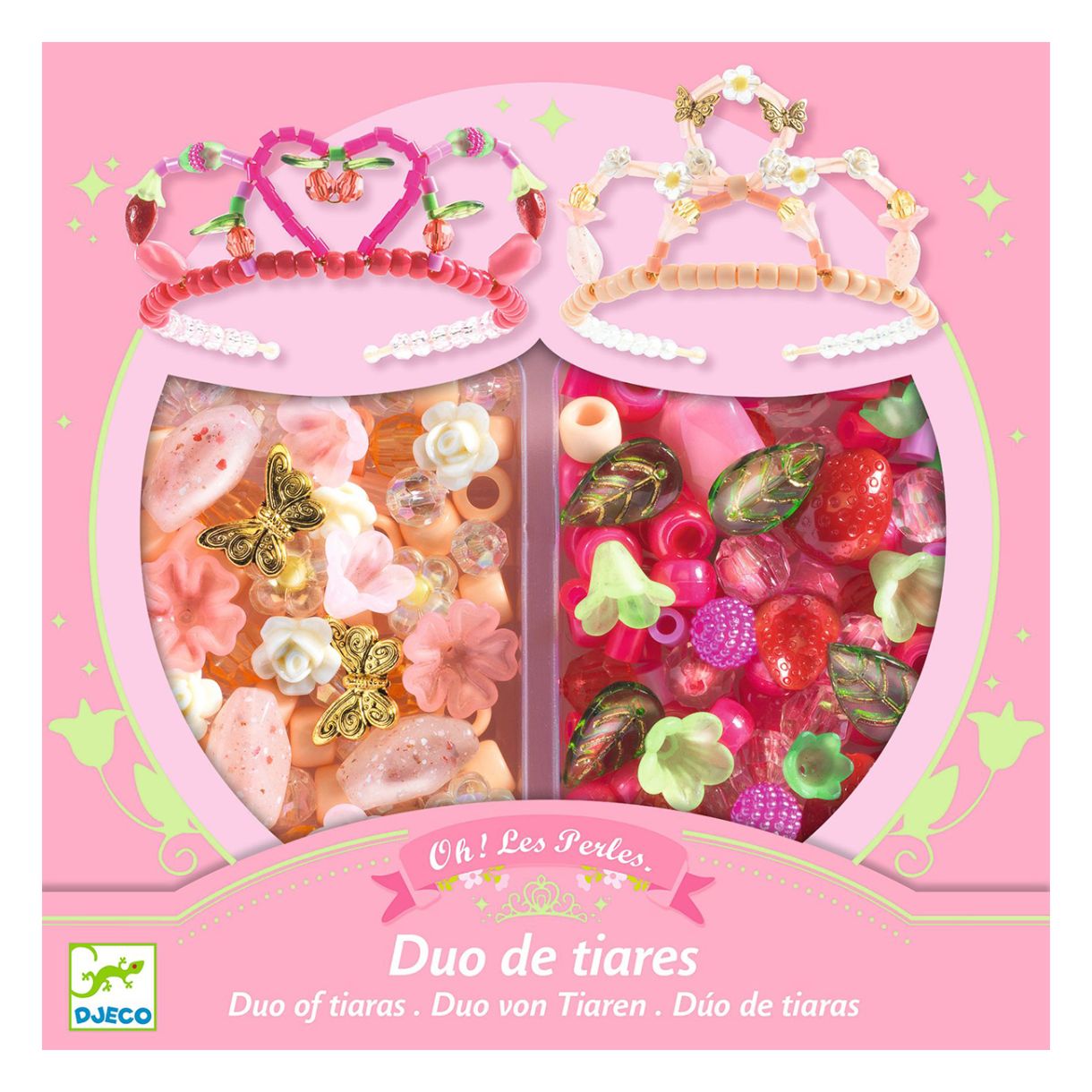 Създайте две великолепни диадеми, достойни за принцеса, с този изчерпателен и лесен за изработка комплект за нанизване с мъниста! С 240 различни акрилни мъниста, златни ленти за глава и гъвкав метален конец, децата разполагат с всички необходими материали, за да направят елегантни, блестящи аксесоари.
