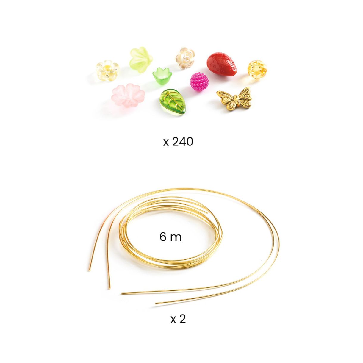 - Пълен комплект с 240 различни мъниста, 2 златни диадеми за глава и гъвкав метална тел за създаване на 2 разкошни диадеми.