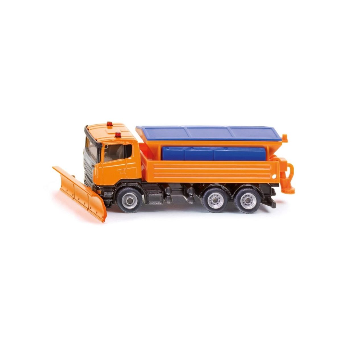Този 3-осен камион снегорин с разпръскваща каросерия от Aebi-Schmidt е основното превозно средство за безопасно шофиране през зимата. Шофьорската кабина и каросерията на Scania са изработени от метал. Острието за почистване отпред може да се завърта надясно и наляво. Моделът се движи на плавно движещи се колела с гумирани гуми.