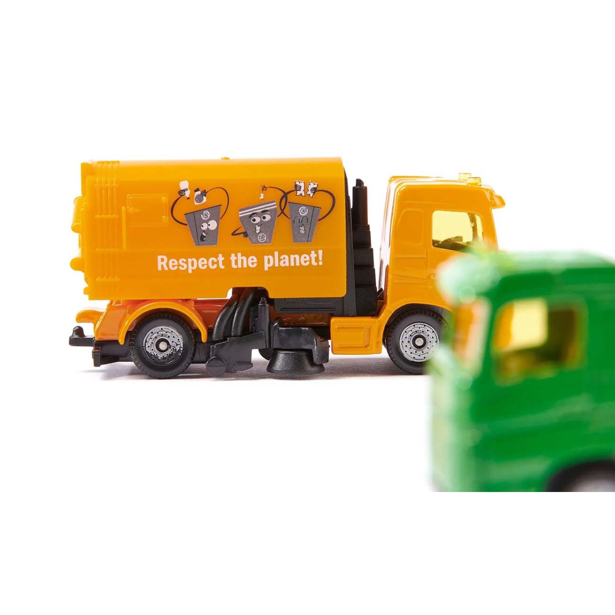 Този нов комплект за общински цели от SIKU внася чистота и ред в града – сега със свеж дизайн! Камионът за боклук блести в ярко зелено, а уличната метачка се откроява в наситено оранжево, като и двата модела са с модерен принт. Заедно това мощно дуо гарантира, че улиците и площадите остават безупречно чисти и е готово за всяка задача в стаята за игра. И двата модела имат здрави, двуосни пластмасови шасита с плавно въртящи се колела и здрави метални кабини. Уличната метачка е оборудвана с пластмасова каросерия и вакуумна система, докато камионът за боклук има самосвална каросерия и отваряща се задна врата. Щампата „Почисти града си“ върху камиона за боклук подчертава мисията: С този комплект малките градски чистачи могат с ентусиазъм да се захванат за работа и игриво да поддържат нещата чисти.