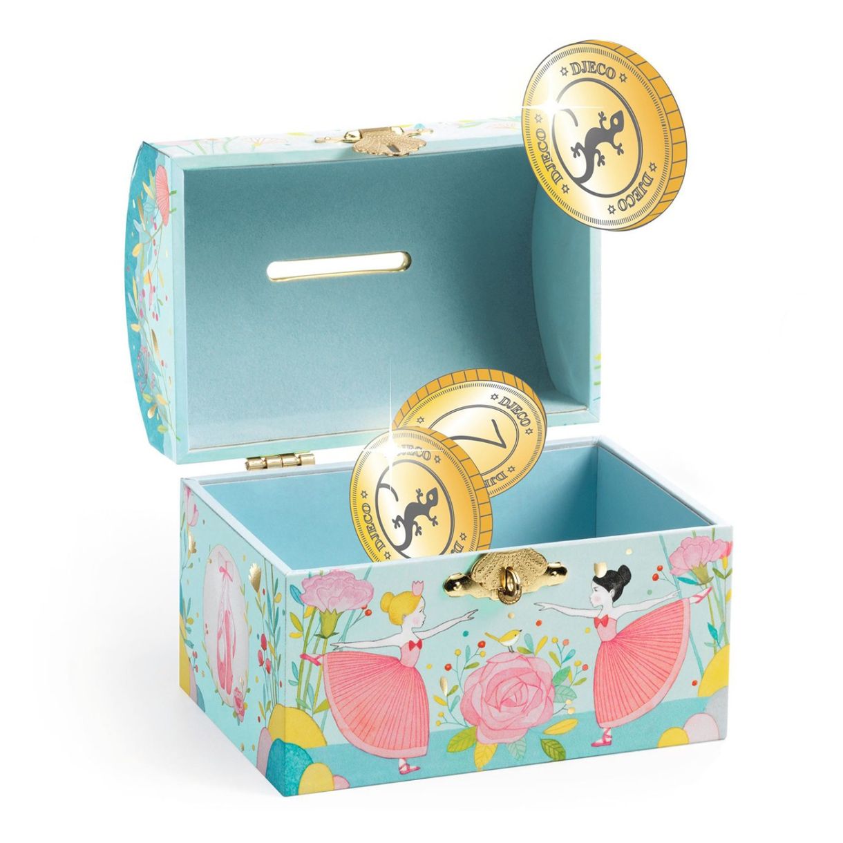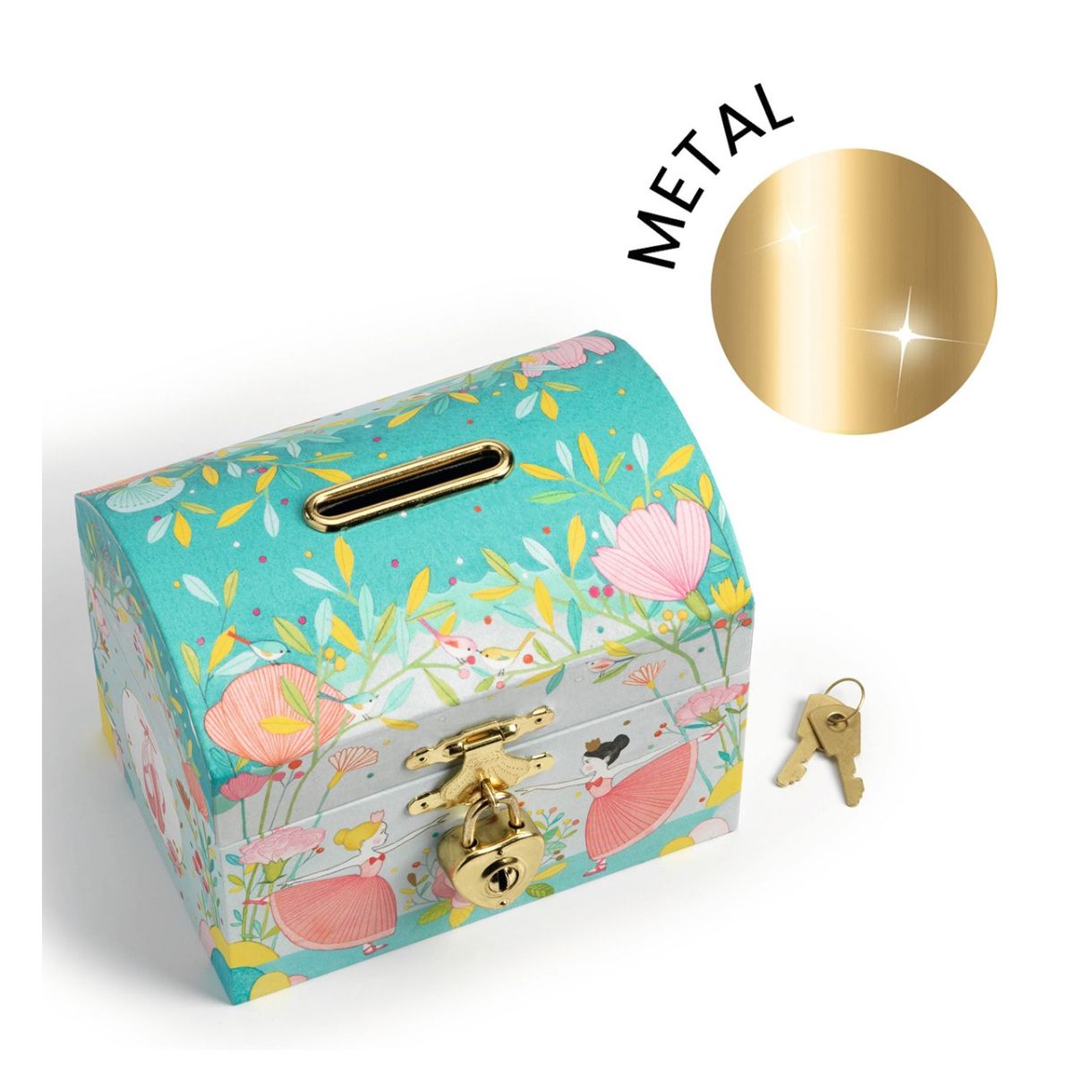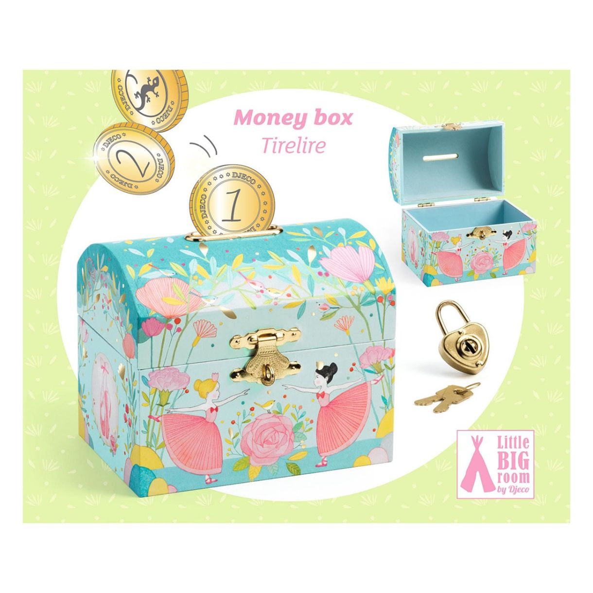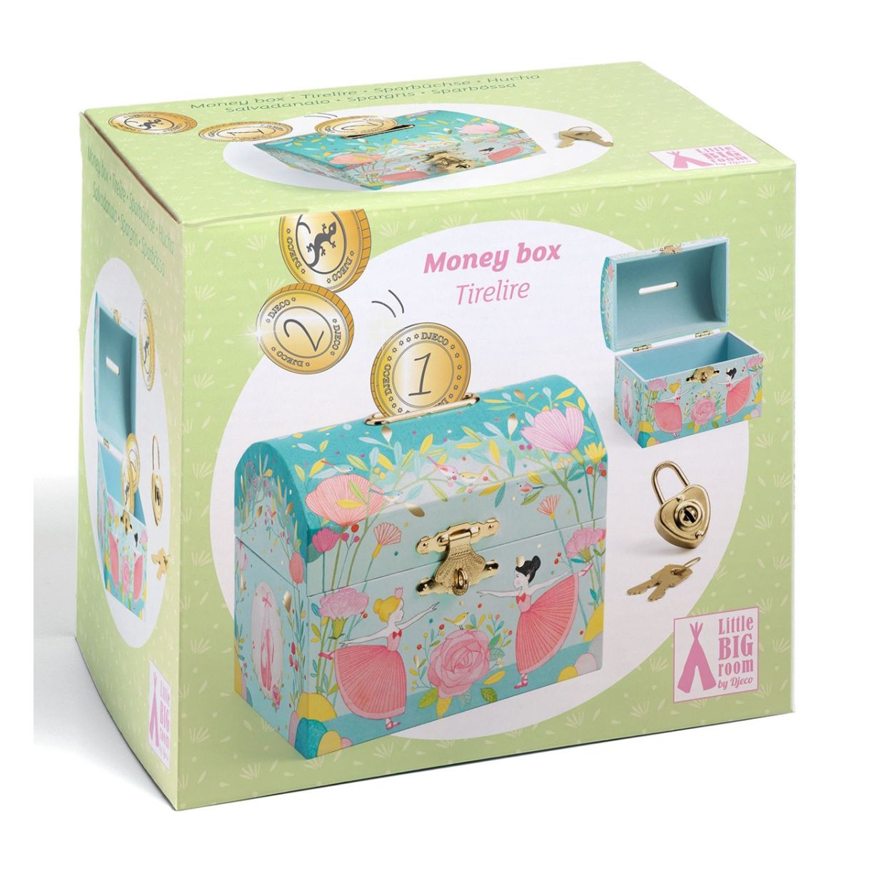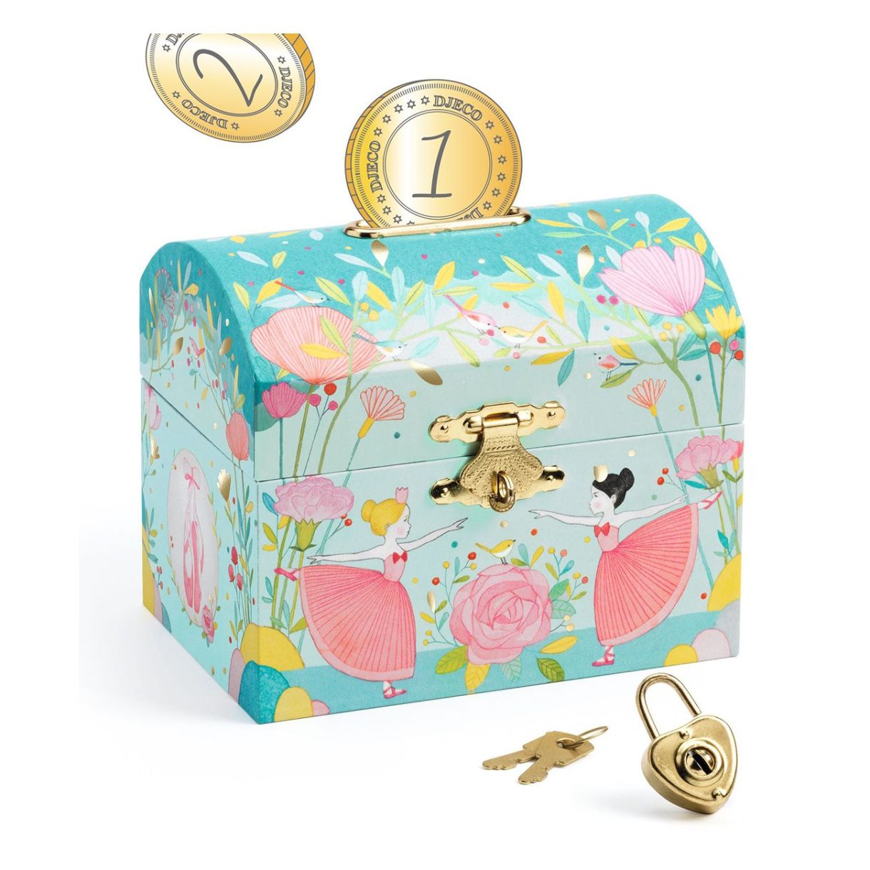 Открийте тази превъзходна касичка, която служи и като сандък със съкровища. Прекрасен декоративен предмет с пасторални илюстрации на балерини: перфектно допълнение към спалнята на вашето дете. Надеждно заключена, касичката се предлага с 2 ключа, за да можете да запазите всички пари, които сте спестили.