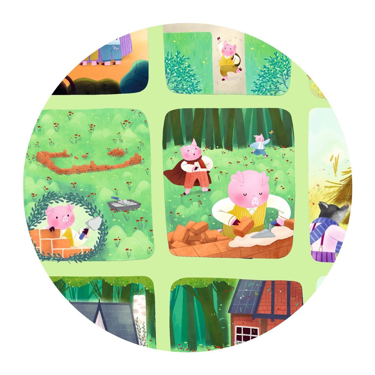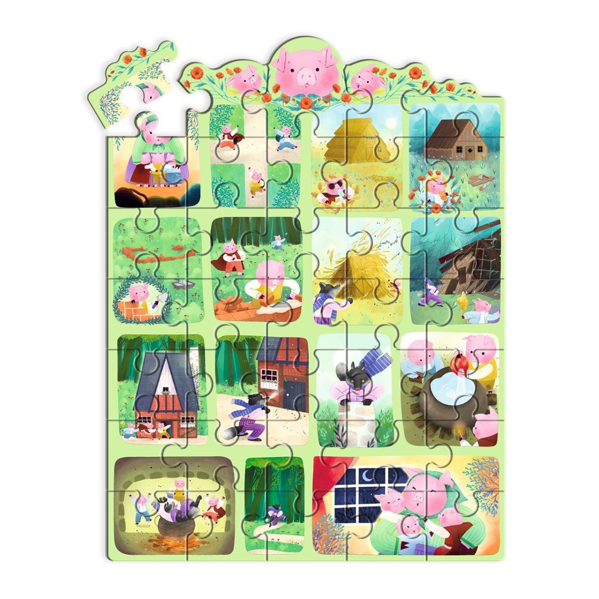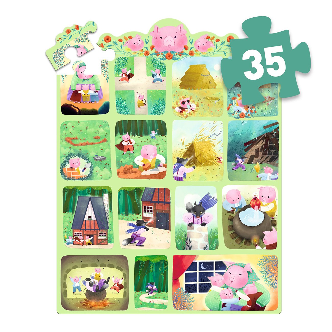 Сглобете пъзела, за да разкриете известната приказка за Трите прасенца под формата на тих комикс. Този превъзходен пъзел от 35 части се предлага в красива кутия.
