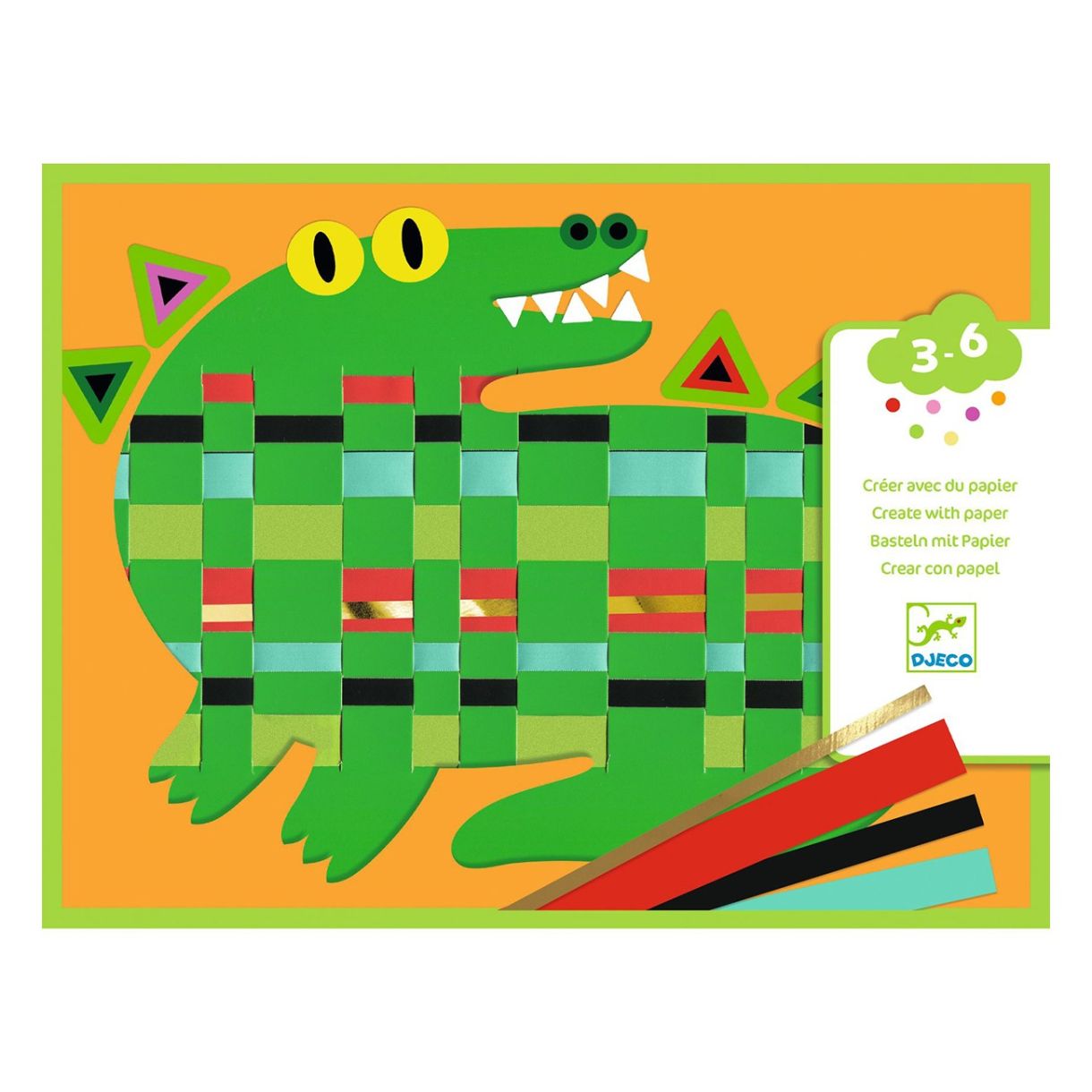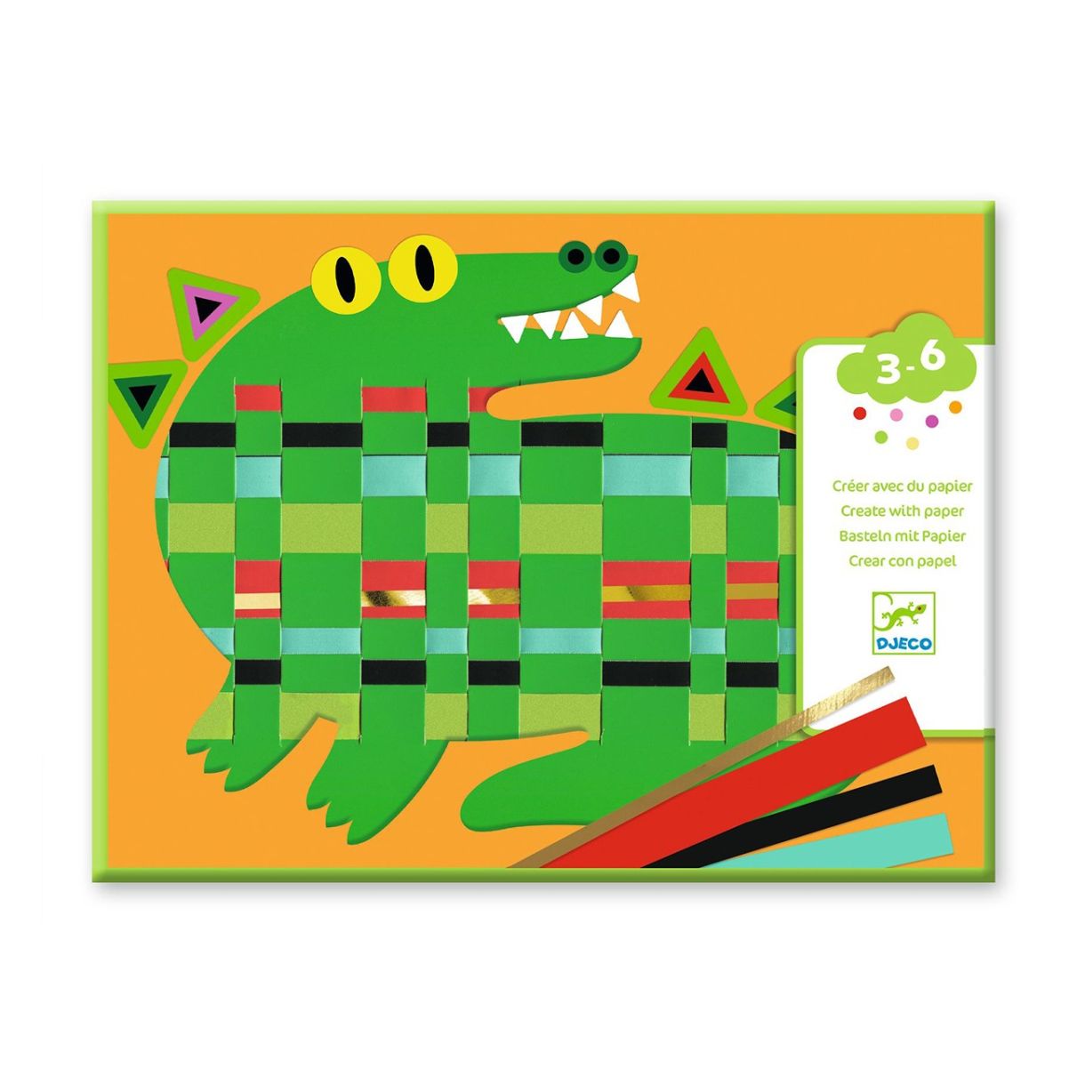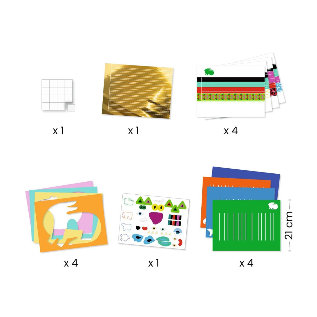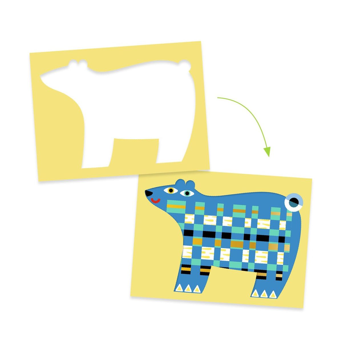 За всяко животно откъснете лентите хартия и, следвайки брошурата, ги сплетете отгоре и отдолу. След това изолирайте тъканата част с маска във формата на животно и добавете вашите стикери, за да създадете прекрасна тъкана картина!