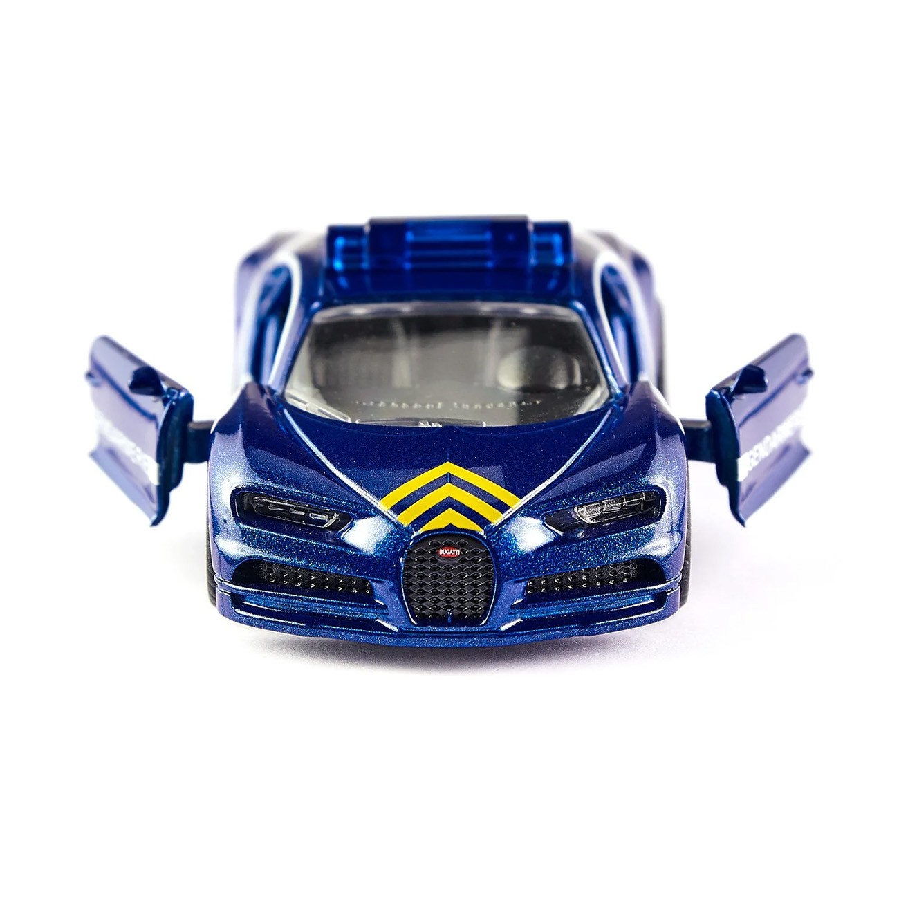 Най-бързата полицейска кола в света ускорява до 100 км/ч за 2,3 секунди и се движи с 420 км/ч. Във Франция Bugatti Chiron се управлява само от специално обучени служители. Полицията използва специалните гуми от гумиран материал с спортните джанти за преследване на престъпници, които се движат с превишена скорост. Супер спортната кола е боядисана от siku в дизайн, който е верен на оригинала. Само казваш едно, две и вече летиш с 100км/ч.