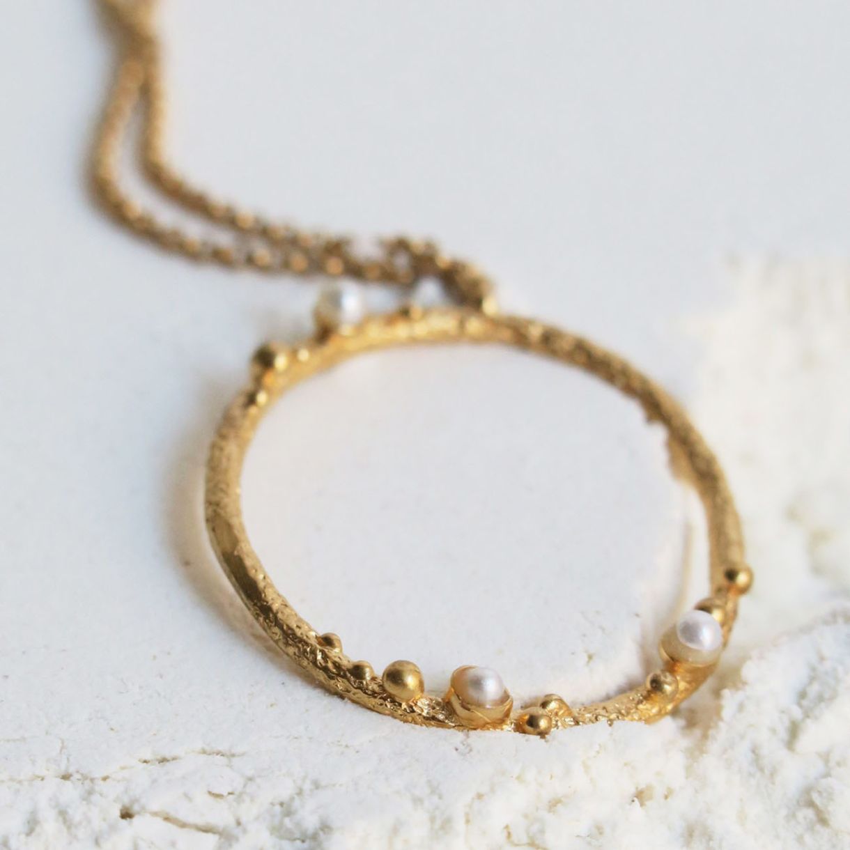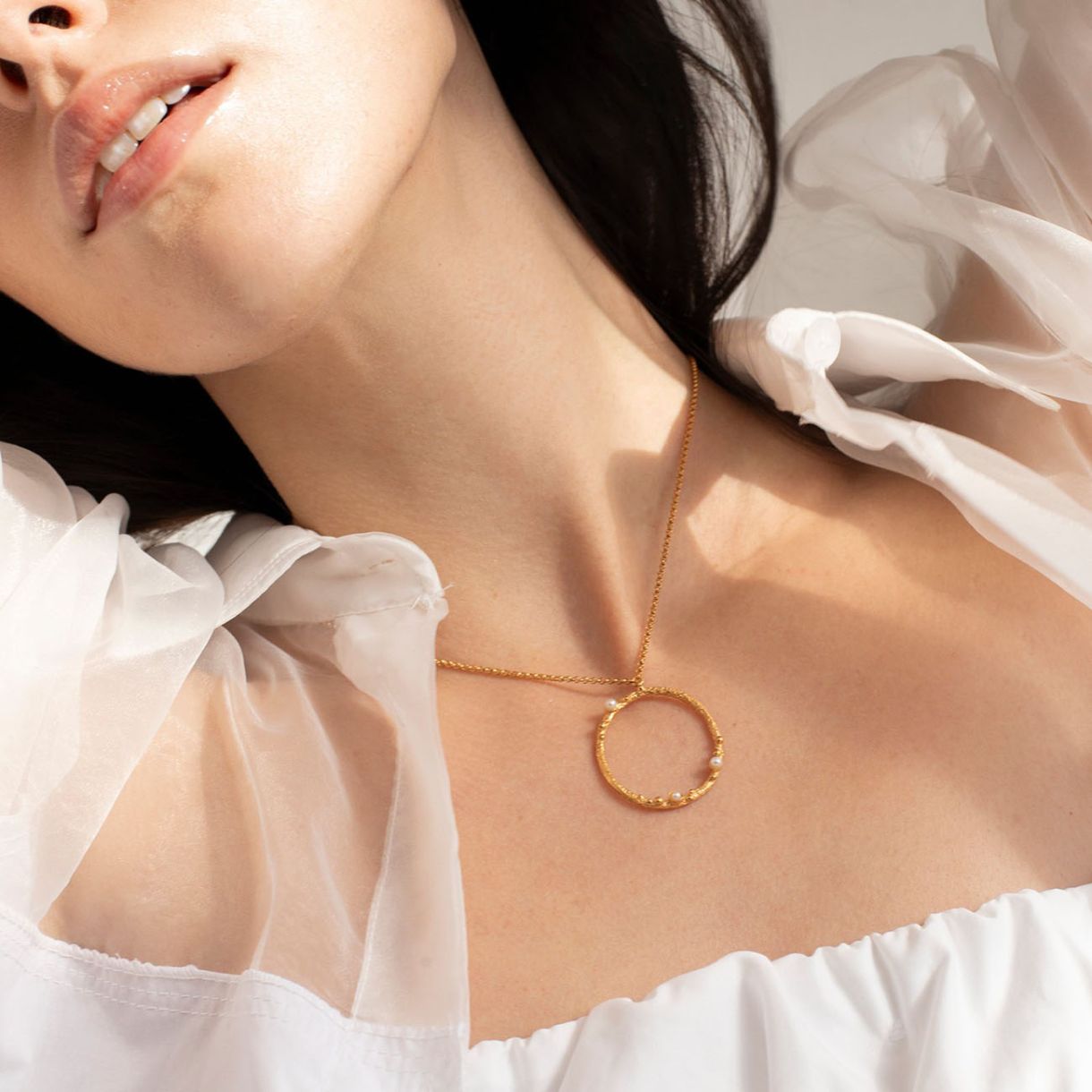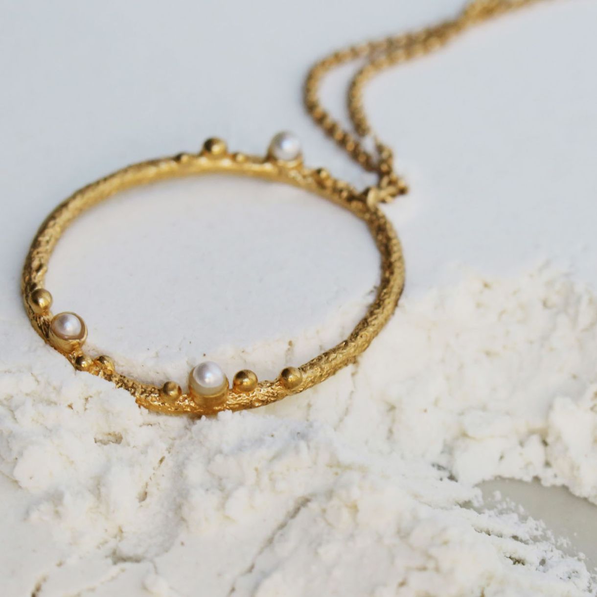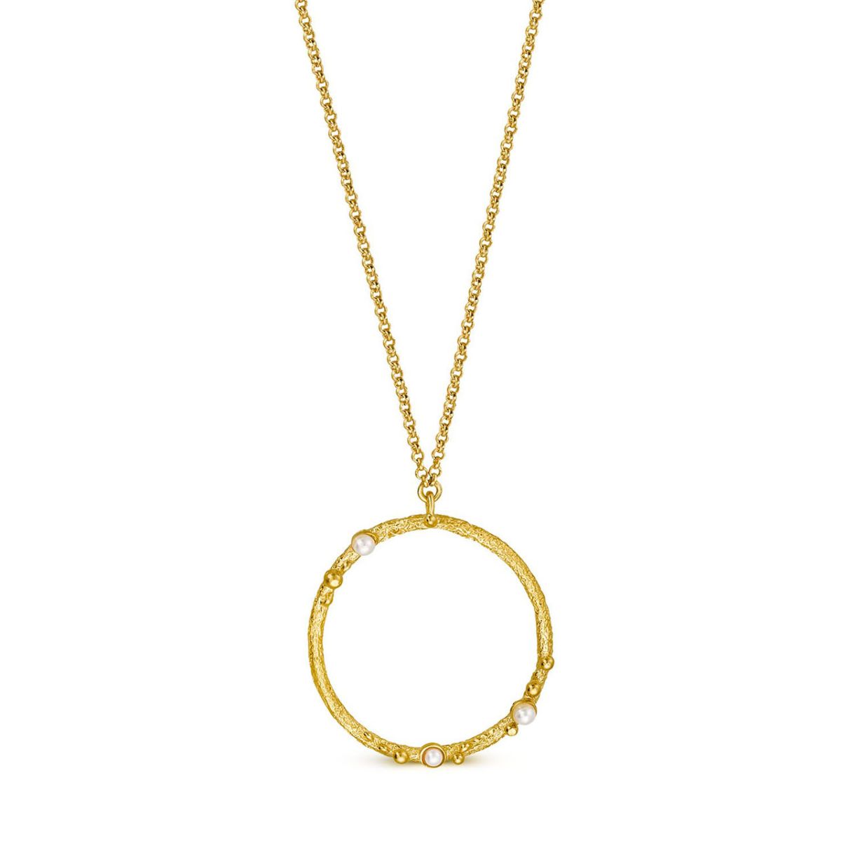 Колие с текстурирана златна кръгла висулка. Детайли от метални топчета и нежни перли на основата на смола улавят експлозия от щастие. Изработено от сребро 925 с 24-каратово позлатено. Верижка със закопчалка тип омар и удължителна верижка.