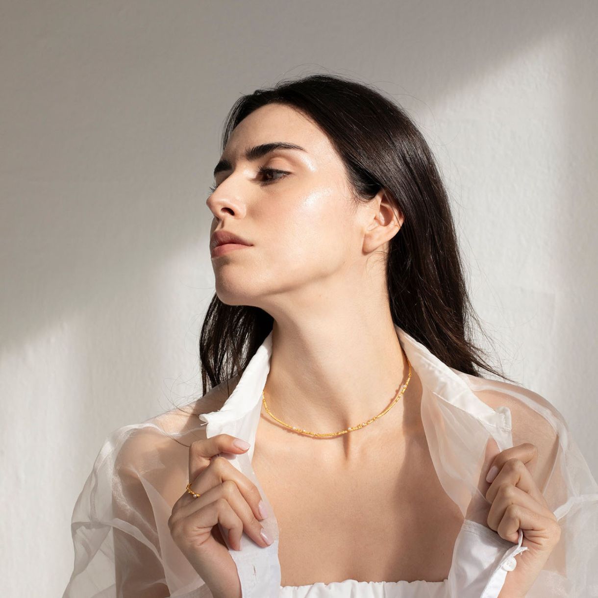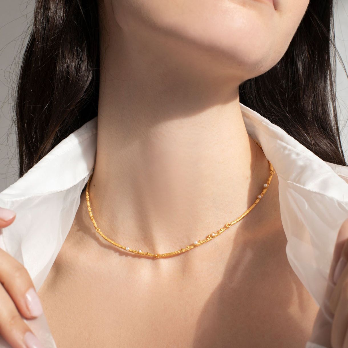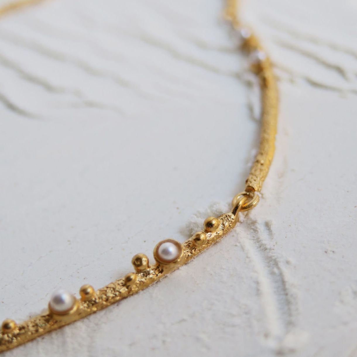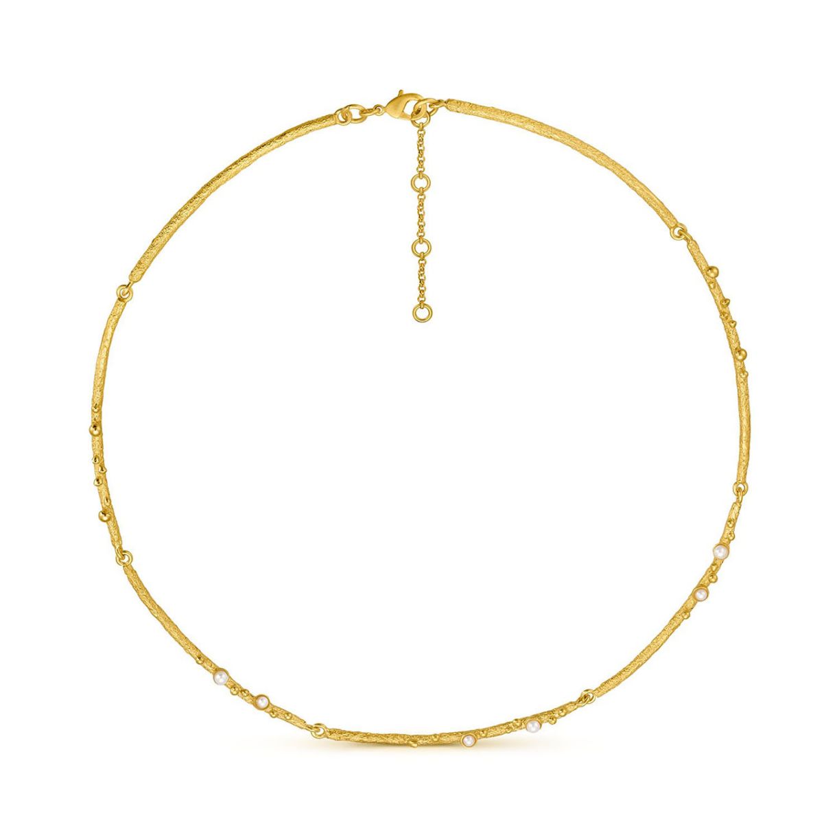 Колие с текстурирана кръгла висулка от сребро. Детайли от метални топчета и деликатни перли на основата на смола улавят експлозия от щастие. Изработено от сребро 925 с 24-каратово златно покритие.  Верижка със закопчалка тип омар и удължителна верижка.
