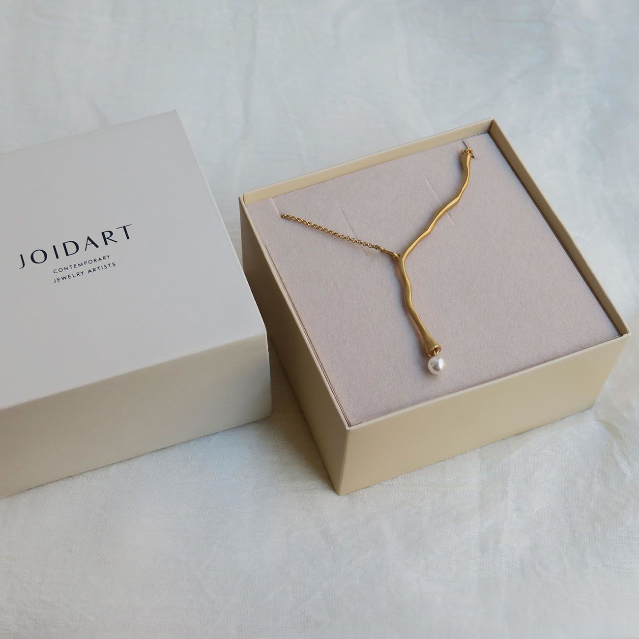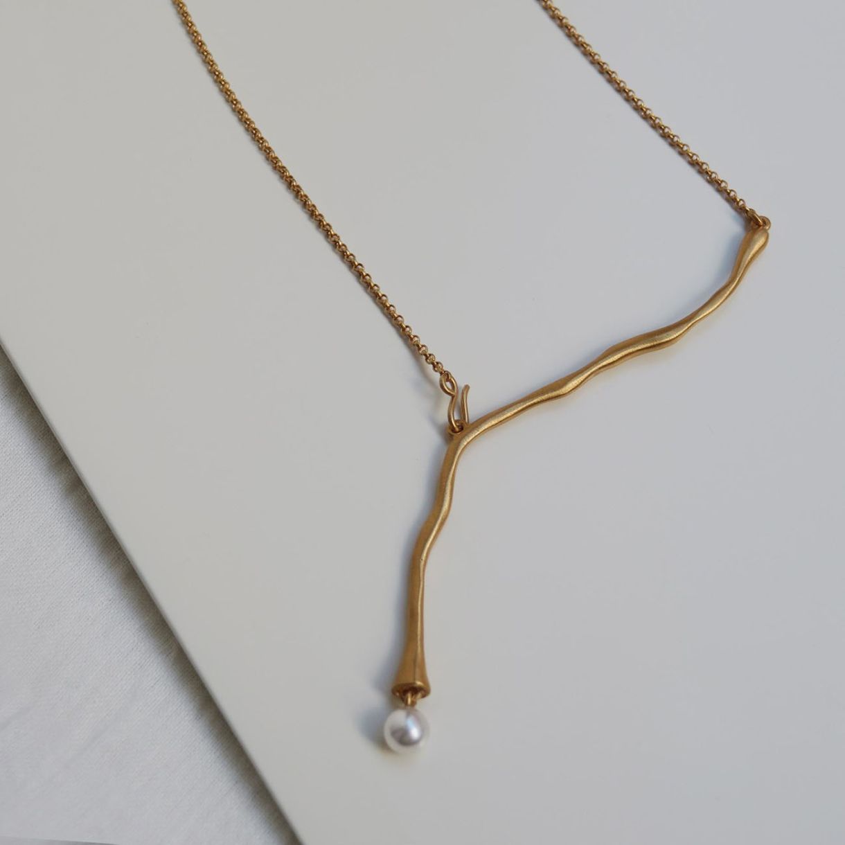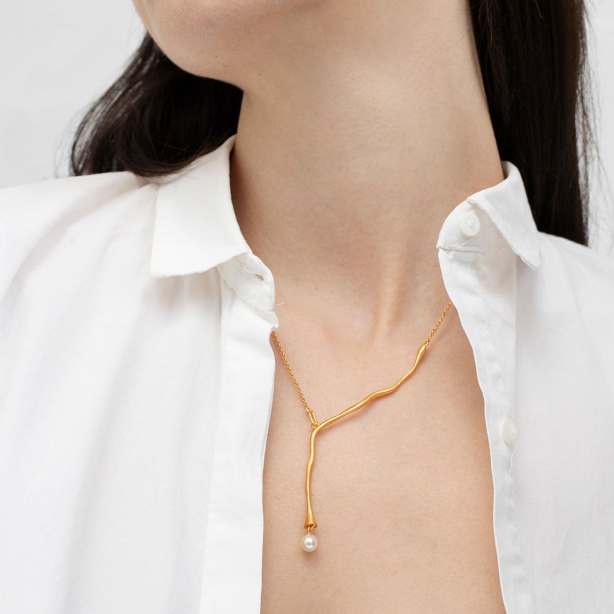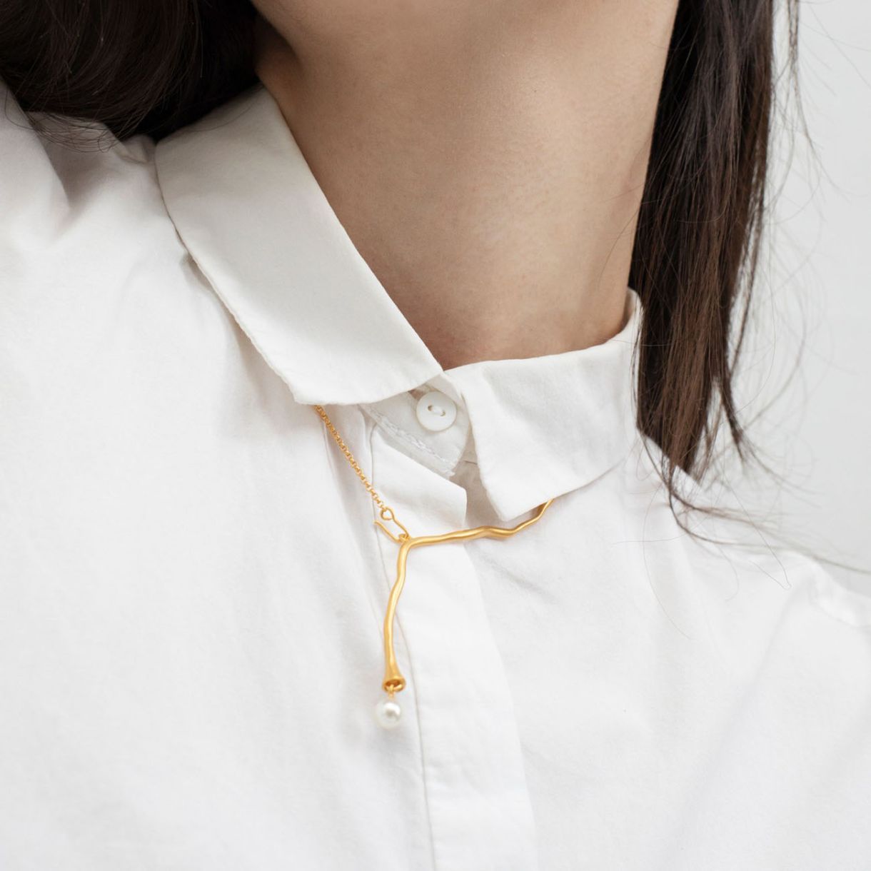 Специално колие с удължен и извиващ се централен мотив. Изработено от матов метал с 24-каратово позлатено покритие и перла от муранско стъкло на края. Закопчаване тип „омар“ и удължаваща верижка.