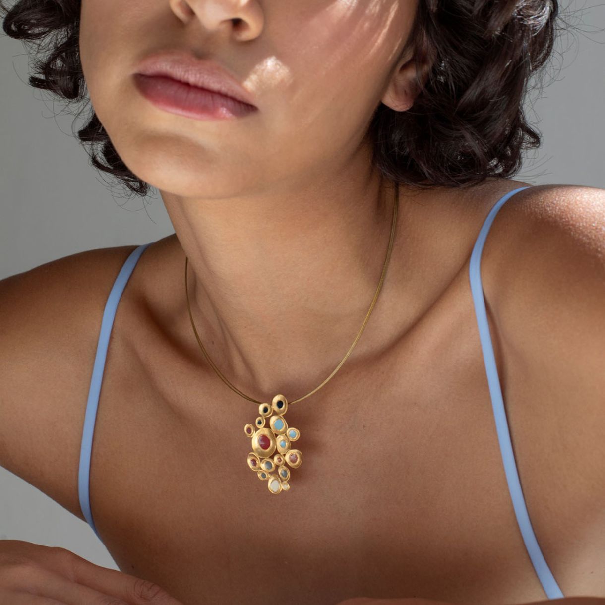 Голямо колие от матов метал с 24-каратово позлатено злато, изработено от множество неправилни форми с многоцветен студен емайл.Позлатена стоманена тел с ключалка тип „омар“ и удължаваща верижка.