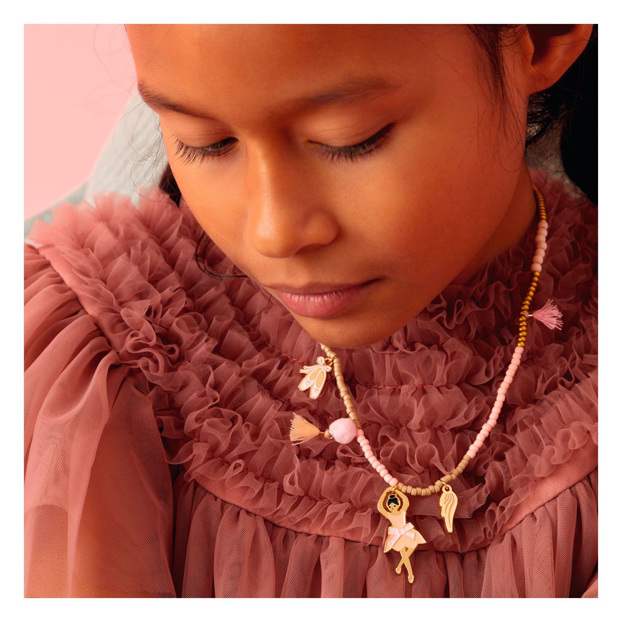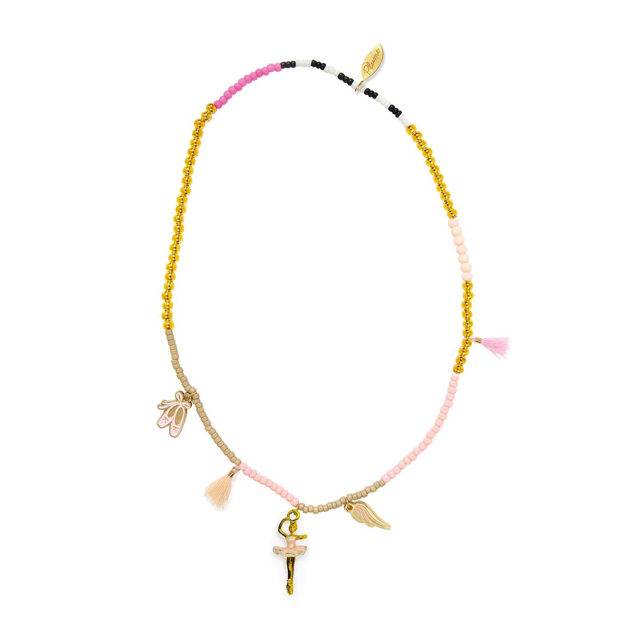 Потопете се в света на танца с изящното колие Isadora. Изработено от акрилни мъниста, пет деликатни украшения - три емайлирани метални балерини, крило и балетни пантофки - и две памучни помпони. Това колие е едновременно елегантно и забавно. Двойната му еластична нишка го прави изключително издръжливо и лесно за поставяне, без да е необходима закопчалка.