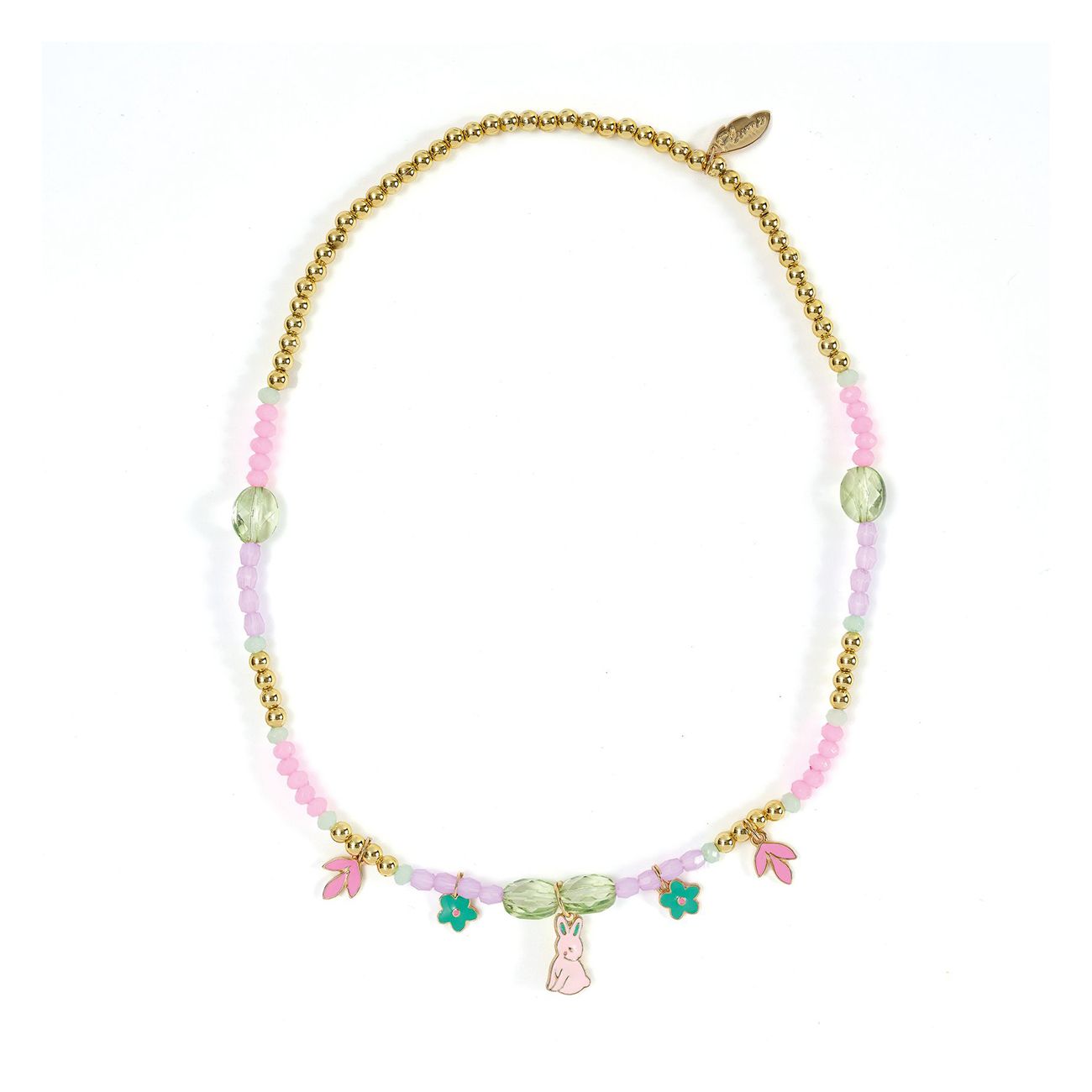 Разходете се в очарователна градина с колието Camélia. Изработено е от акрилни мъниста и пет деликатни емайлирани метални висулки: две листа, две цветя и зайче. Това колие е едновременно сладко и очарователно. Двойната му еластична нишка го прави изключително устойчиво и лесно за поставяне, без да е необходима закопчалка.